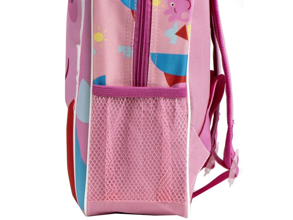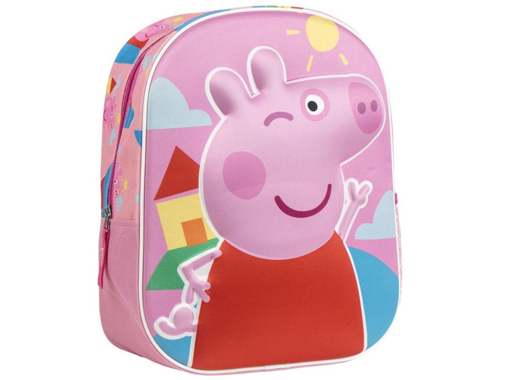 3D dětský batoh v růžové barvě vyvedený s motivem prasátka Pepy. Batoh má jednu velkou kapsu. Batoh je opatřen uchem na nošení v ruce a dvěma nastavitelnými popruhy na záda.