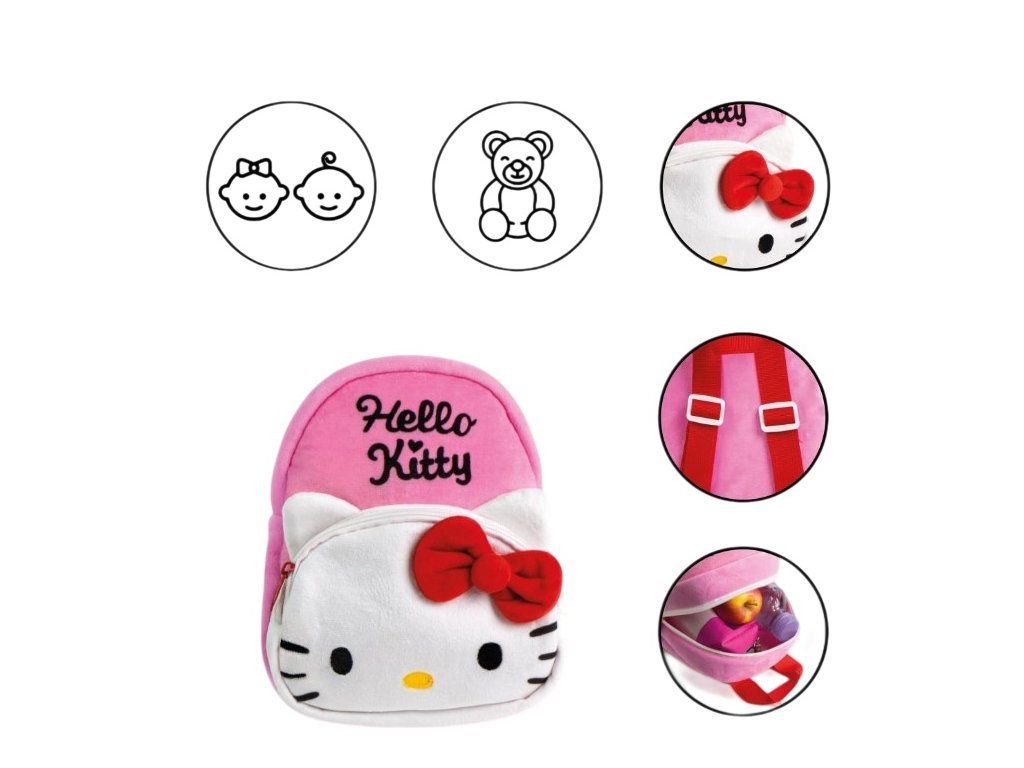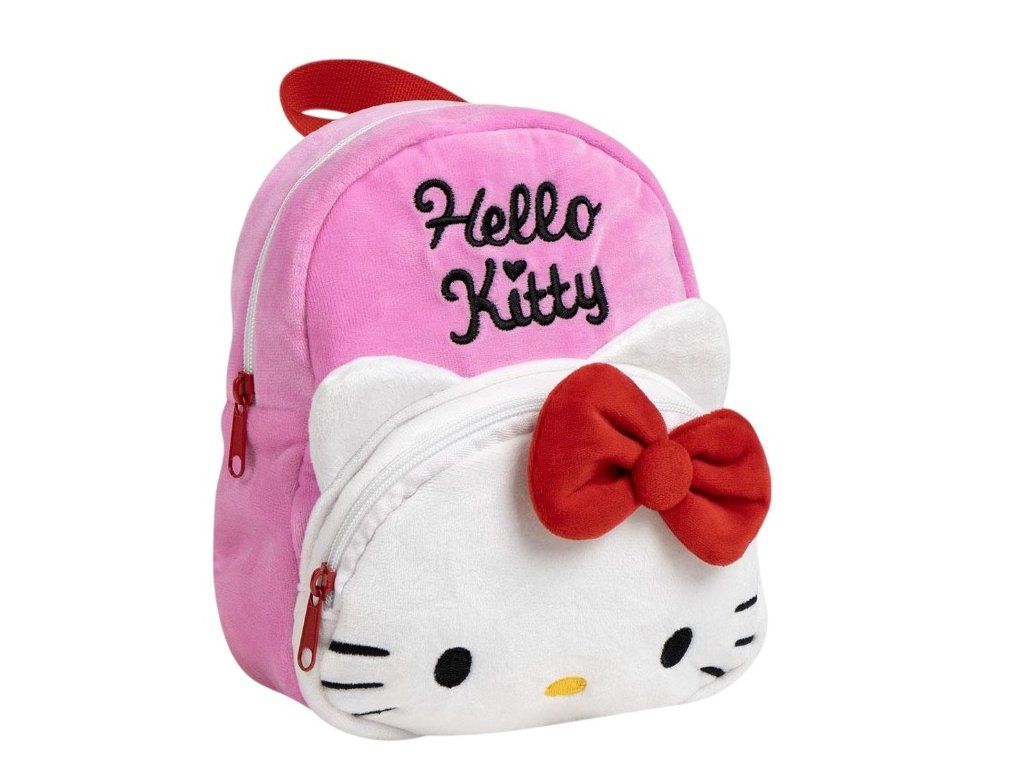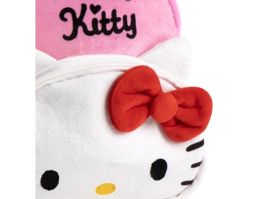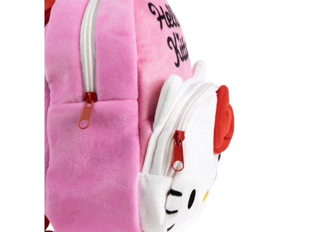 Roztomilý dětský batoh s motivem oblíbené postavičky Hello Kitty potěší každou malou milovnici této ikonické kočičky. Batoh je vyroben z příjemného plyšového materiálu a zdobí ho typická červená mašle, která dodává batohu hravý a stylový vzhled. Díky lehké konstrukci a pohodlným nastavitelným ramenním popruhům se batoh dětem dobře nosí. Hlavní kapsa poskytuje dostatek prostoru na svačinu, oblíbenou hračku nebo drobnosti do školky, zatímco menší přední kapsa na zip je ideální na malé poklady. Měkký a hebký design v růžovo-bílé kombinaci z něj dělá perfektní doplněk na každodenní dobrodružství.