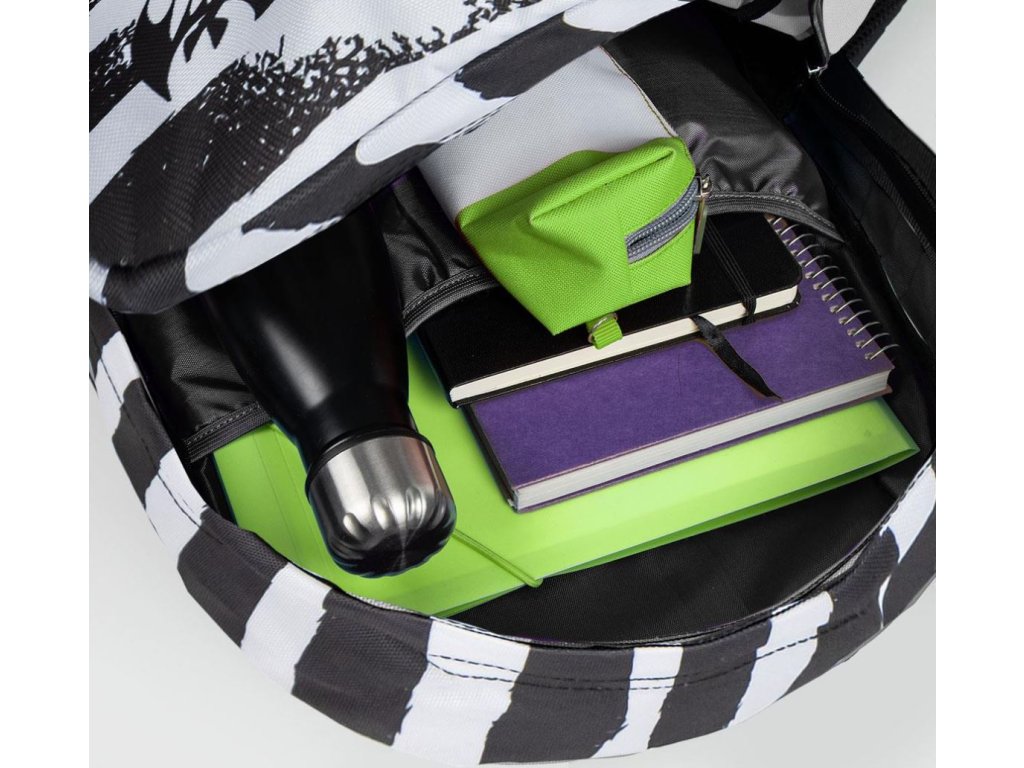 Černo-bílý batoh inspirovaný Jackem Skellingtonem. Batoh má jednu hlavní velkou kapsu, menší kapsu na drobnosti a cennosti, kapsu na láhev na pití. Batoh je opatřen uchem na nošení v ruce a dvěma nastavitelnými popruhy na záda.