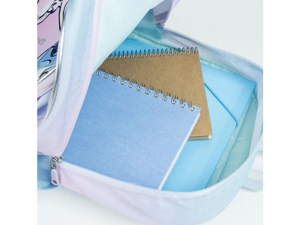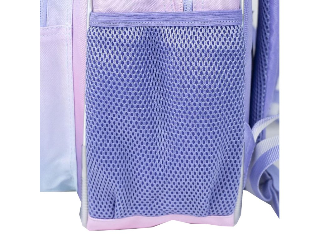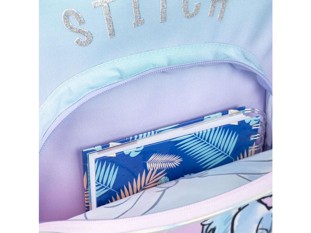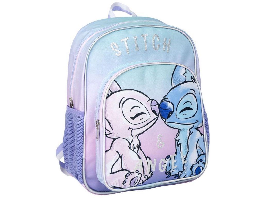 Atraktivní modro-fialový školní batoh s grafikou eskymácké pusy Angel a Stitche z pohádky Lilo and Stitch. Batoh disponuje vysoce kvalitním materiálem, ochranými gumovými rohy, dvěma síťovanými kapsami na láhve, jmenovkou na popruhu, ergonomicky tvarovanými zády, možnosti připnutí vozíku na suchý zip. V hlavní kapse batohu najdete také mnoho místa a další kapsy pro všechny potřebné školní věci. Batoh má dále i menší přední kapsu na drobnosti a cennosti, ale vejdou se vám do ní například i sešity. Batoh je polstrovaný s délkově nastavitelnými popruhy a uchem pro snadné nošení v ruce. No, prostě parťák pro všechny menší i větší školáky, kteří milují Stitche.