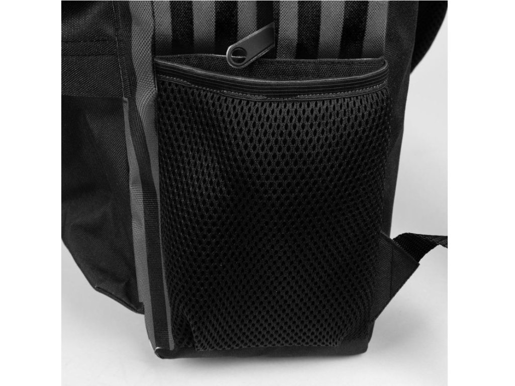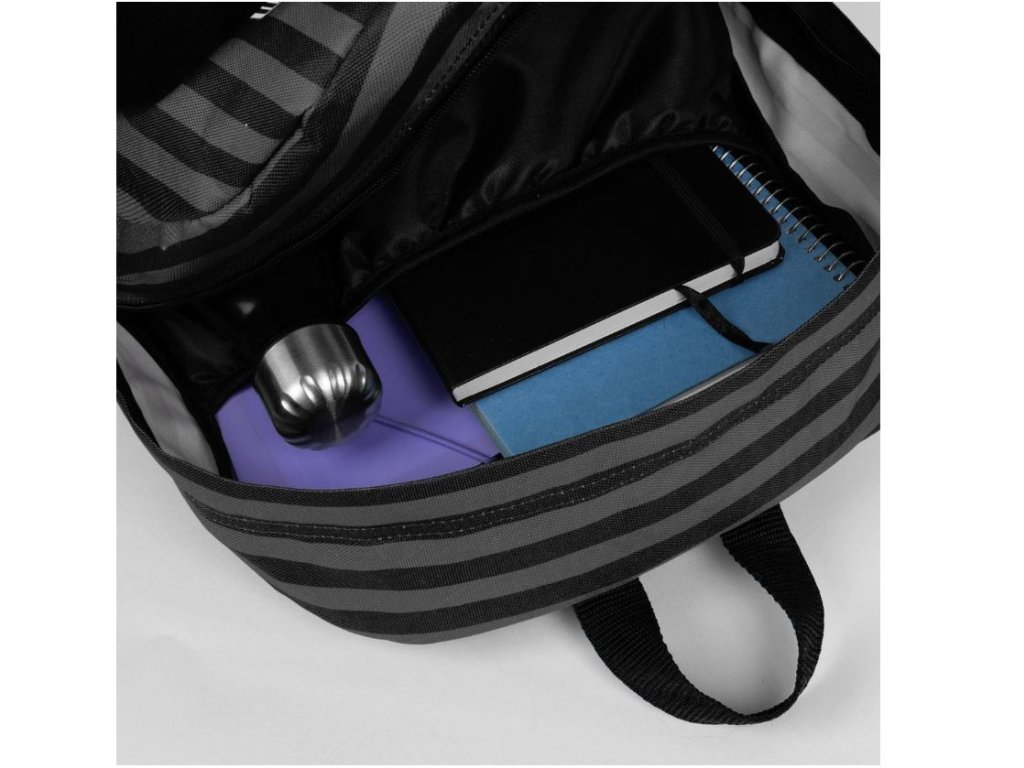 Stylový černý pruhovaný batoh vyvedený s motivem NEVERMORE ACADEMY z populárního seriálu Wednesday od společnosti Netflix. Jednoprostorový školní batoh s přední kapsou a motivem NEVERMORE ACADEMY na přední straně. Batoh má na boku menší síťovanou kapsu. Batoh má polstrované záda, délkově nastavitelné popruhy a ucho pro snadné nošení v ruce.