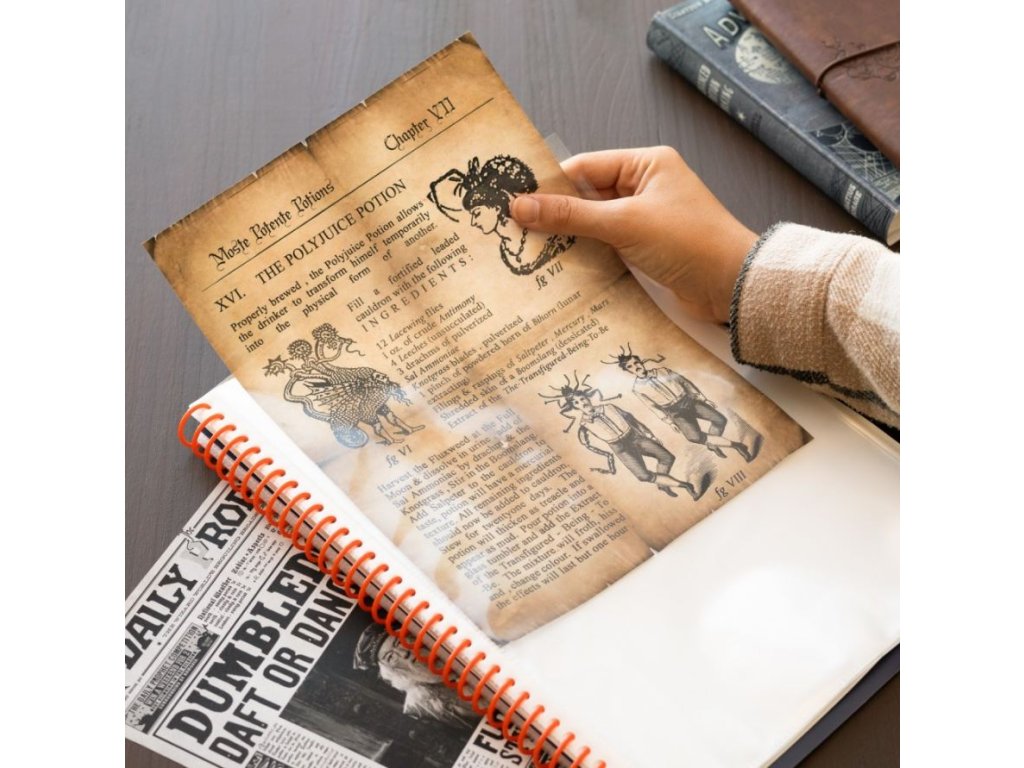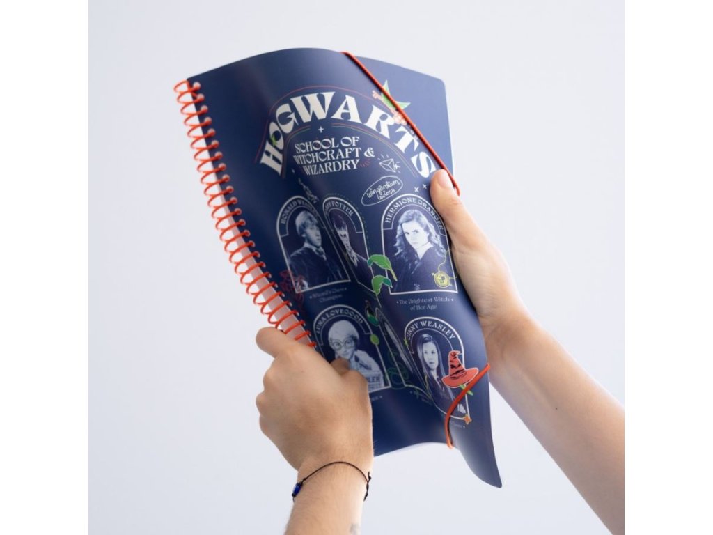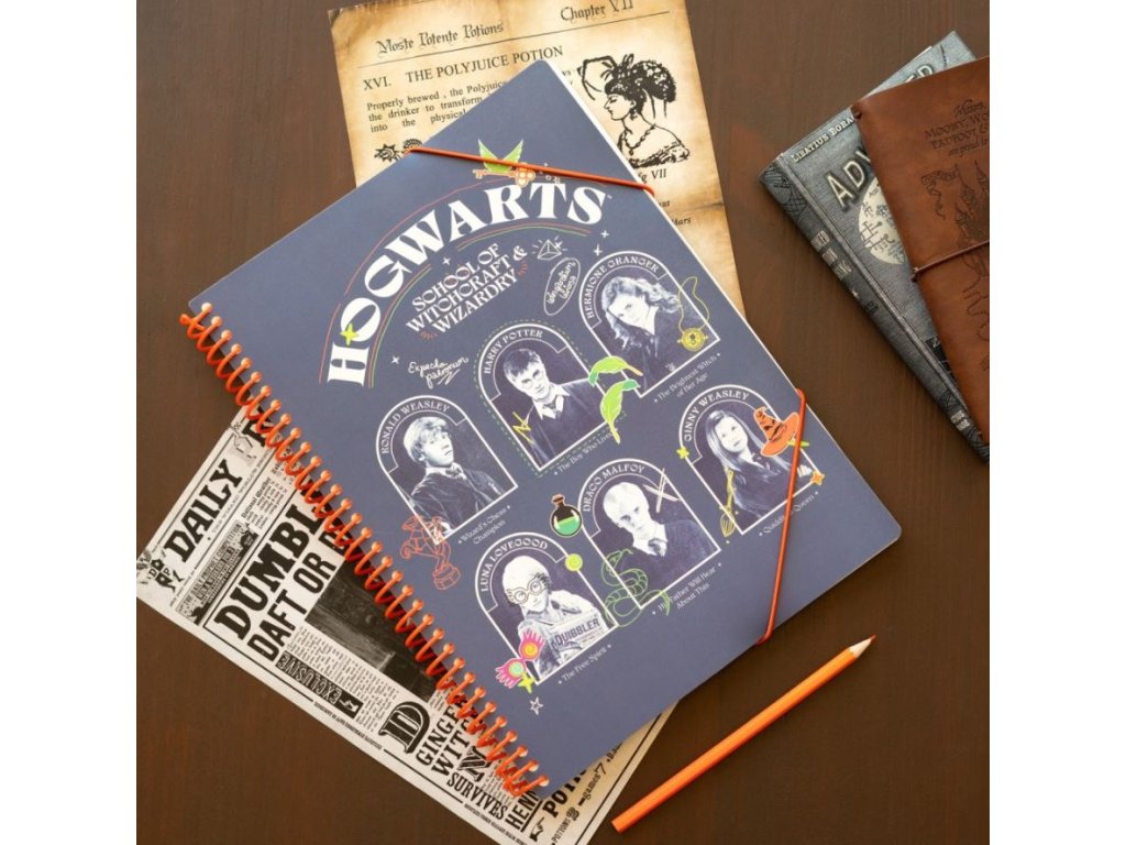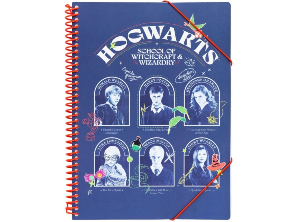 Blok A4 v kroužkové vazbě s 30 průhlednými polypropylenovými obaly, sloužící pro uchovávání vašich materiálů. V těchto průhledných fóliích můžete uchovávat recepty, poznámky, oblíbené články, prostě cokoliv vás napadne a je pro vás důležité. Skvělý společník na doma i na cesty a to vše v designu postav z kouzelnické školy v Bradavicích.