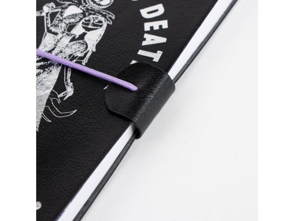 Atraktivní poznámkový zápisník v měkkém černém koženkovém obalu ze syntetické kůže. Na přední straně obalu vytlačena grafika srdce a lebky z muzikálu Ukradené Vánoce. Koženkový obal stahovatelný praktickou gumou obsahuje 72 linkovaných listů, gumou uchycené v obalových deskách. Zápisník je díky svému designu vhodný i jako dárek pro každého fanouška této postavy.