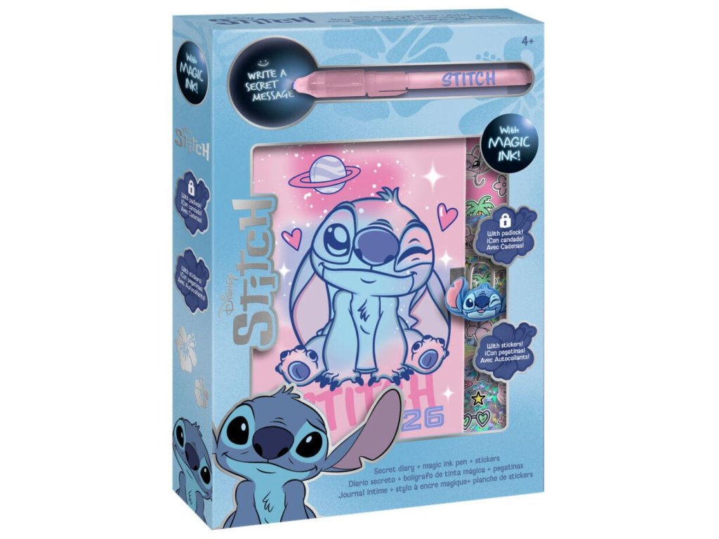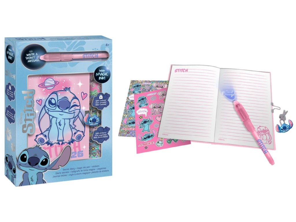 Tahle kouzelná sada s motivem mimozemšťana Stitche je splněný sen pro všechny malé milovníky psaní a tvoření. Obsahuje linkovaný deníček s pevnou vazbou a se zámkem na uzamknutí tajemných poznámek, svítící tajemné pero a spoustu barevných samolepek, které rozzáří každý příběh nebo obrázek. Skvělý společník pro malé snílky, kteří rádi tvoří vlastní svět plný fantazie.