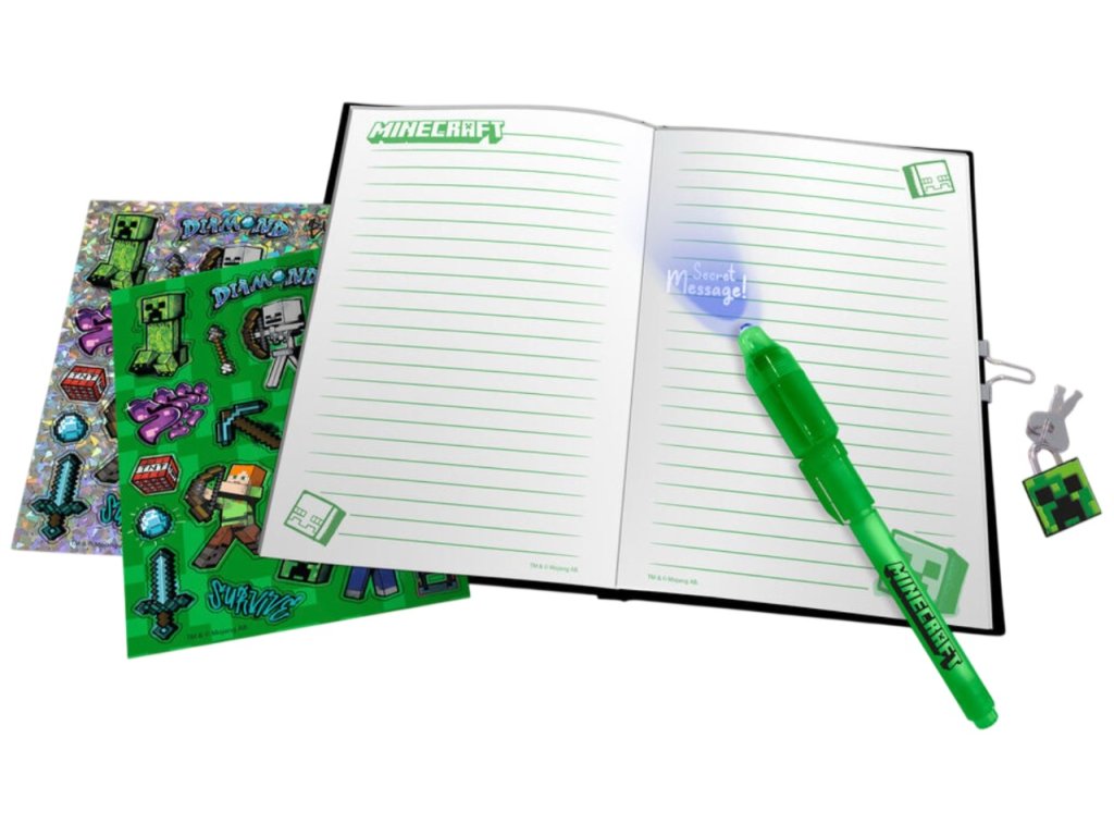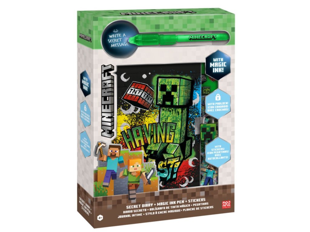 Tahle kouzelná sada s motivem postavy Creeper ze hry Minecraft je splněný sen pro všechny malé milovníky psaní a tvoření. Obsahuje linkovaný deníček s pevnou vazbou a se zámkem na uzamknutí tajemných poznámek, svítící tajemné pero a spoustu barevných samolepek, které rozzáří každý příběh nebo obrázek. Skvělý společník pro malé snílky, kteří rádi tvoří vlastní svět plný fantazie.