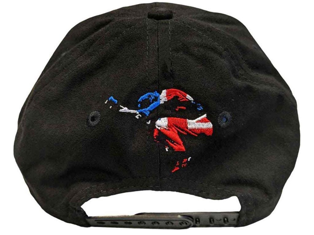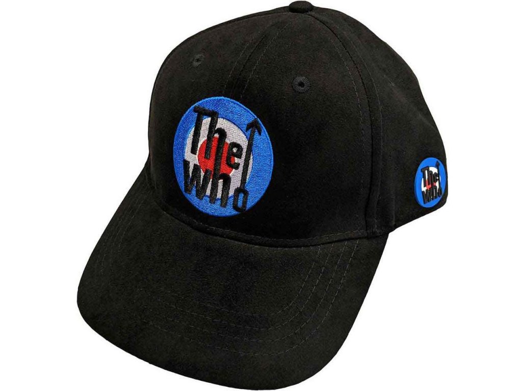 Černá kšiltovka / baseballová čepice s barevnou výšivkou loga slavné rockové skupiny The Who. Výšivka kutaristy v barvách pritské vlajky zátylku čepice. Na levém boku malý barevný odznáček The Who průměru 1,8 cm.