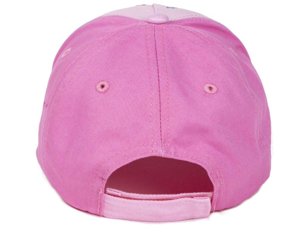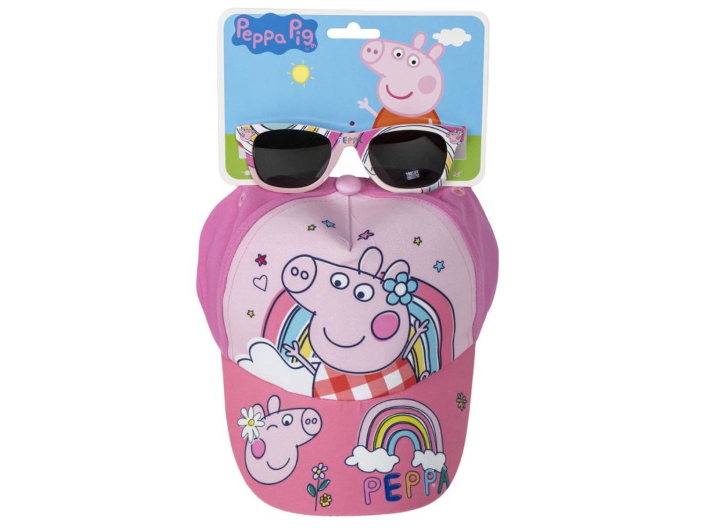 Růžová dětská kšiltovka s grafikou duhy a prasátka Pepy v setu se slunečními brýlemi. Na zadní straně kšiltovky je látkový řemínek na suchý zip, sloužící k nastavení velikosti.