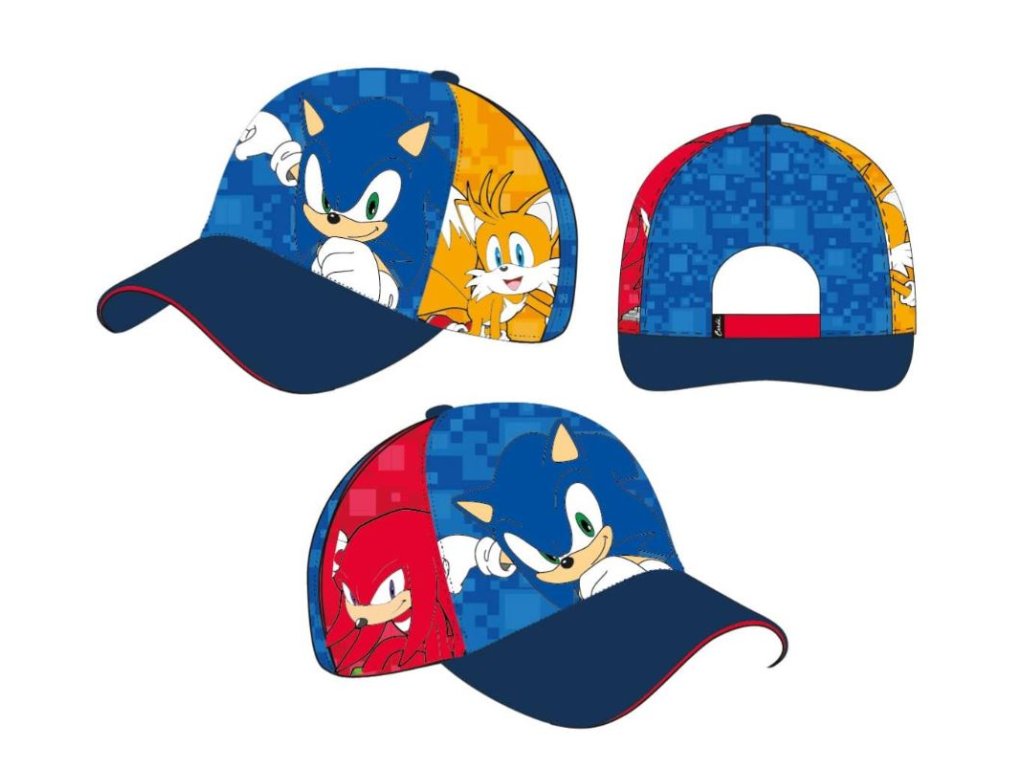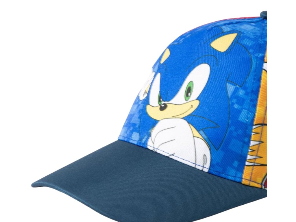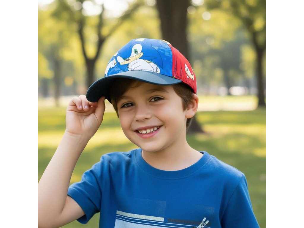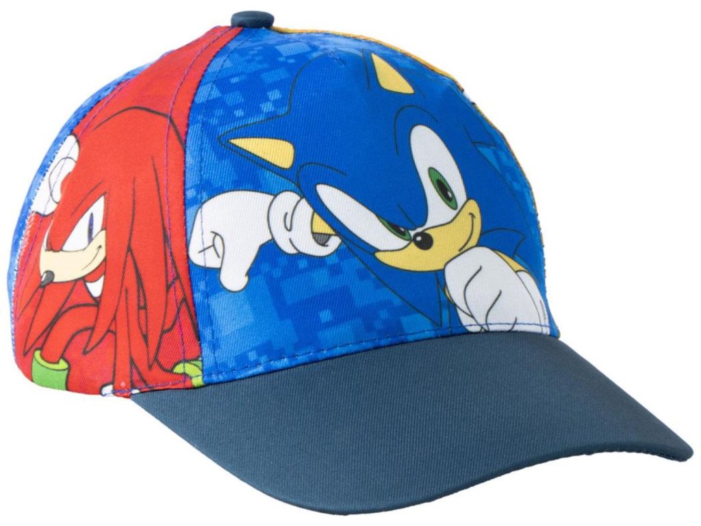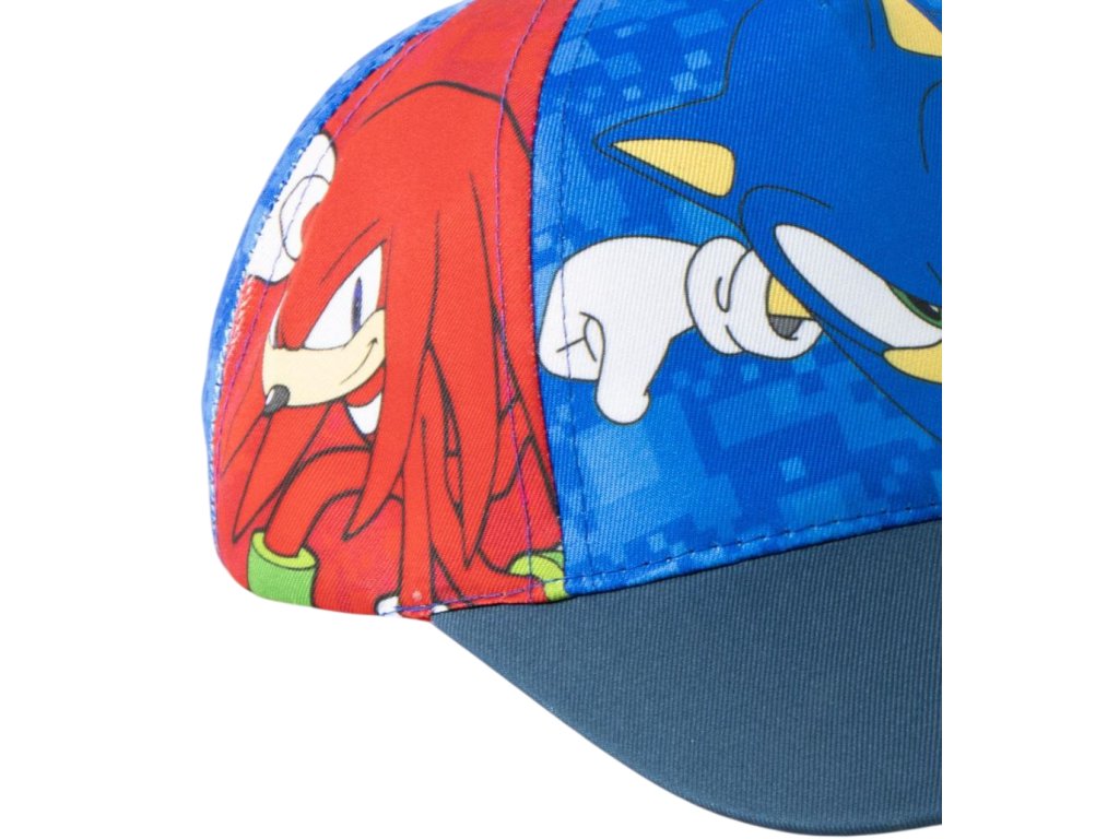 Dětská celopotištěná baseballová barevná kšiltovka s modrým kšiltem. Na kšiltovce je vyobrazen ježek Sonic s přáteli v akčních pózách. Zapínání je na látkový řemínek na zuchý zip, sloužící k upravování velikosti, tak aby čepice dokonale padla na každou hlavu malého fanouška těchto akčních postav.