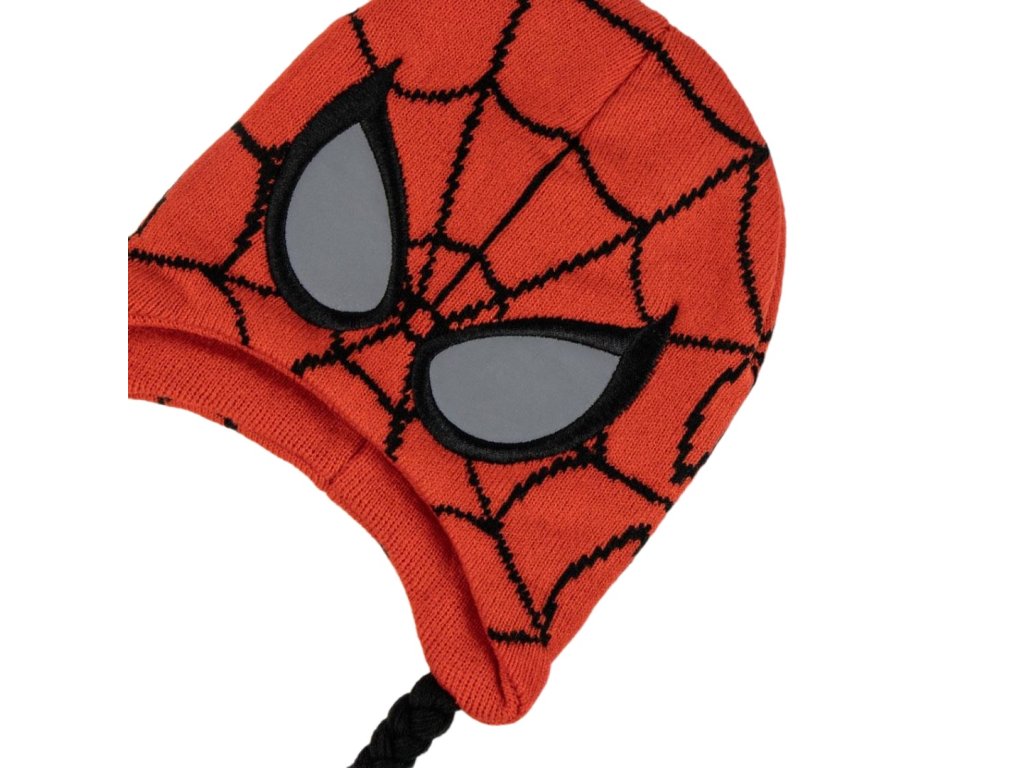 Oficiální produkt - zimní dětská čepice s copánky z katalogu výrobků s grafikou a licencí populárního seriálu a stejnojmenného superhrdiny Spider-man od společnosti Marvel.
