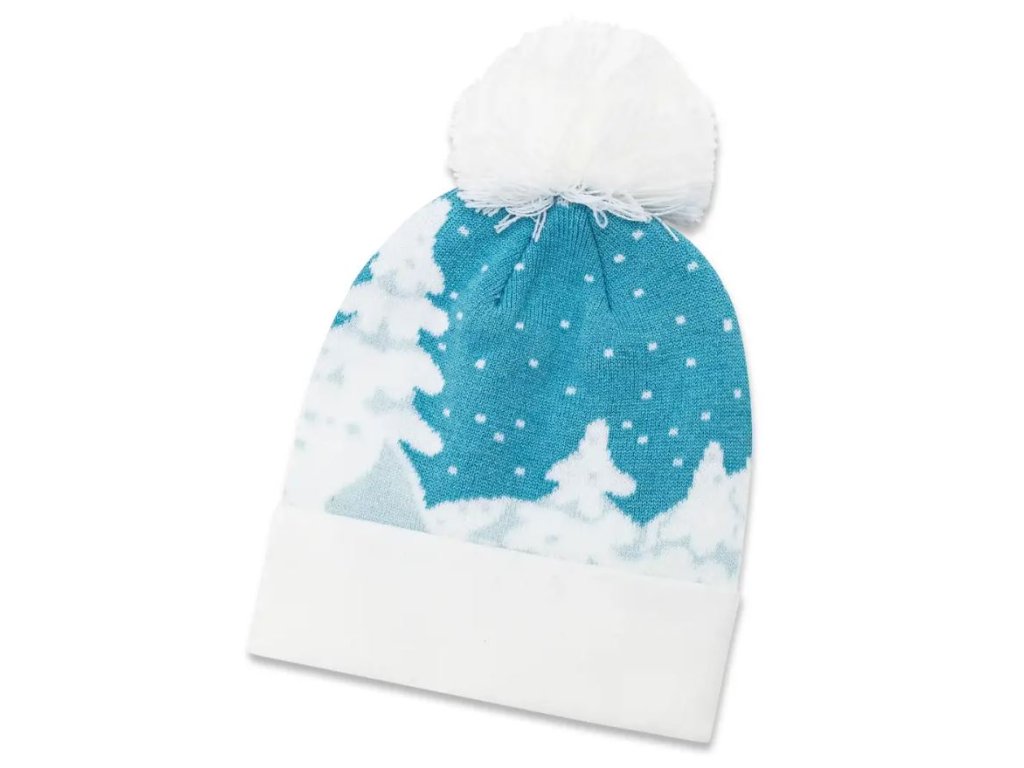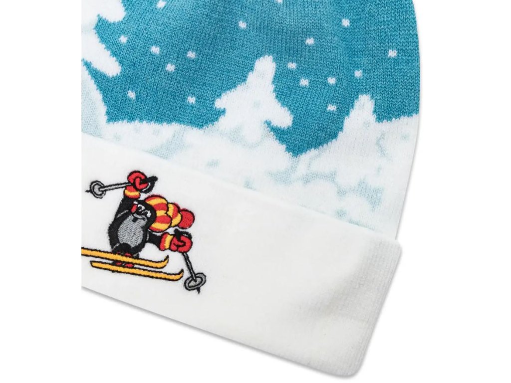 Zimní čepice s bambulí v bílé barvě s vyšitým motivem Krtečka na lyžích. Kulich zdobí pozadí se zasněženými stromy.