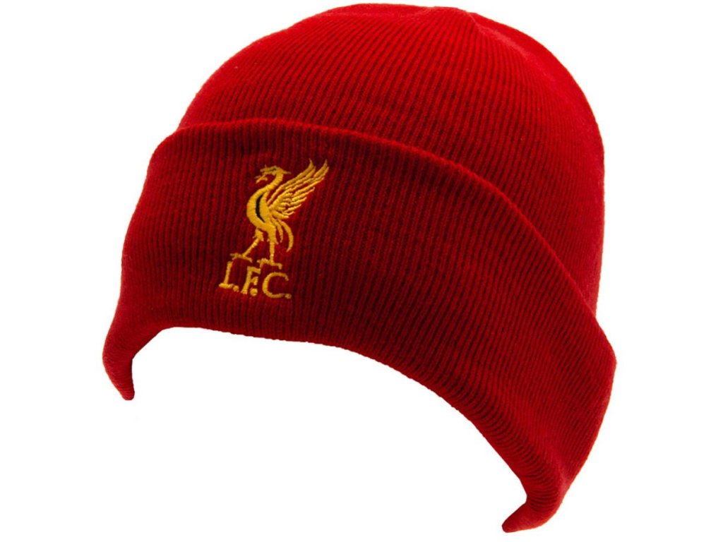 Zimní pletená čepice červené vínové barvy s nášivkou znaku slavného fotbalového klubu Liverpool FC z Anglie.