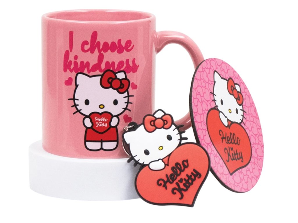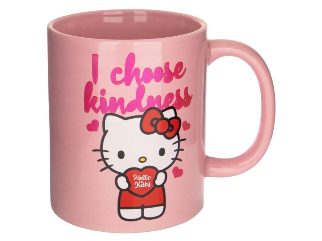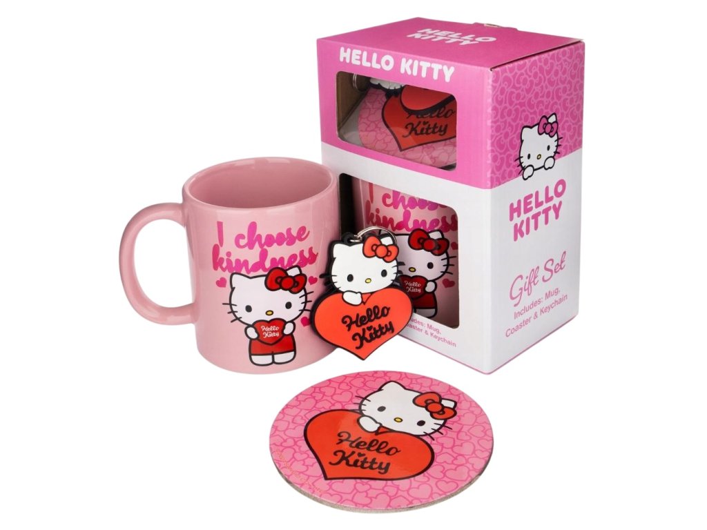 Dárkový set předmětů - klíčenka, hrnek a podtácek, inspirovaný kočkou Hello Kitty a mottem: ,,I choose kidness''. Set hrníčku, podtácku a klíčenky je dodávaný v dárkové krabičce se stejným motivem, a proto je celá sada vhodná jako dárek pro každého menšího i většího fanouška této roztomilé kočičky.