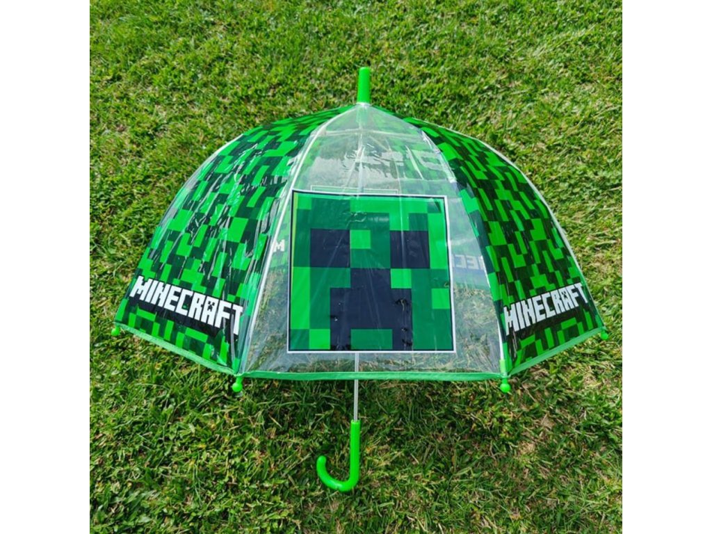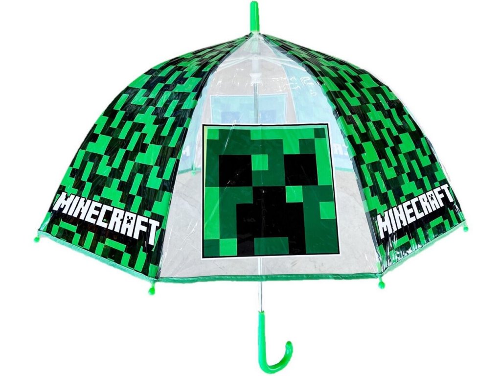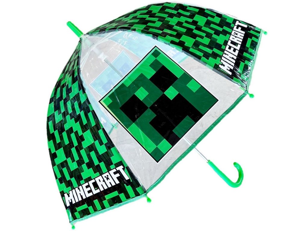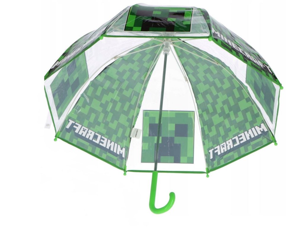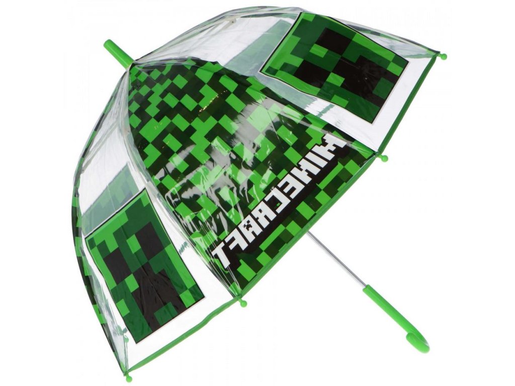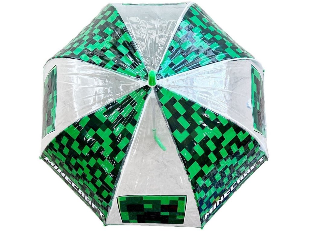 Automatický průhledný deštník s rukojetí vyvedený s barvou a grafikou postavy Creepera z počítačové hry Minecraft. Zajišťovací mechanismus slouží proti samovolnému složení deštníku.
