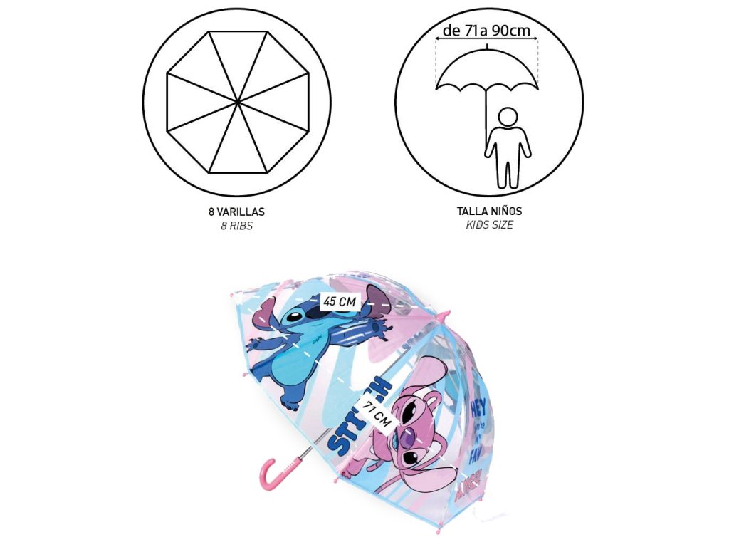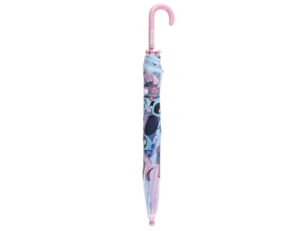 Manuální deštník s průhledným designem a barevnými detaily postavy Stitche a Angel. Deštník má plastovou ohnutou rukojeť.