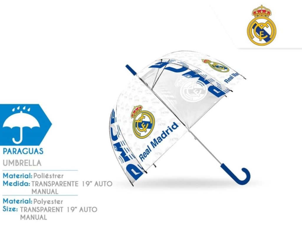 Atraktivní transparentní manuální dětský deštník s logy a nápisy populárního fotbalového týmu Real Madrid. S tímto deštníkem se každému menšímu i většímu fotbalovému fanouškovi bude chtít na zápas i v dešti.