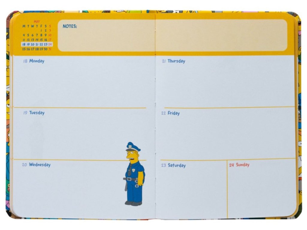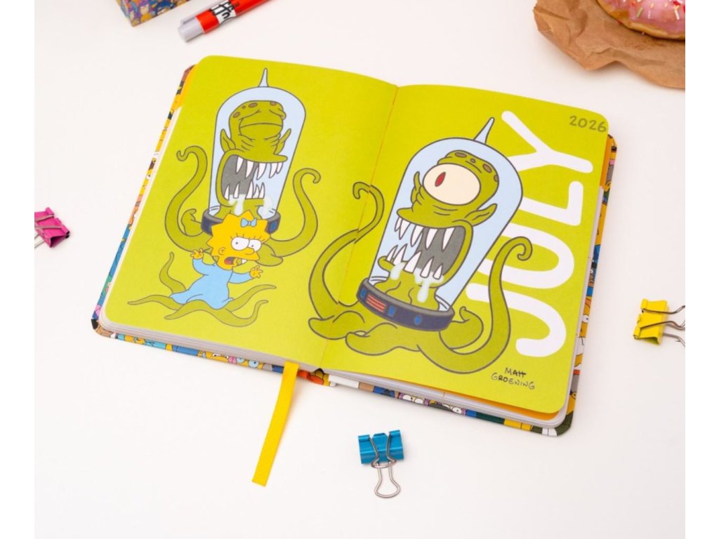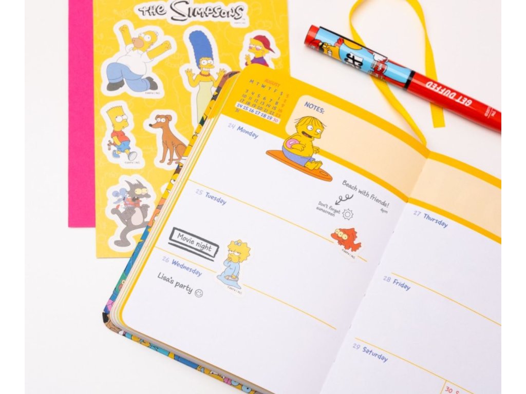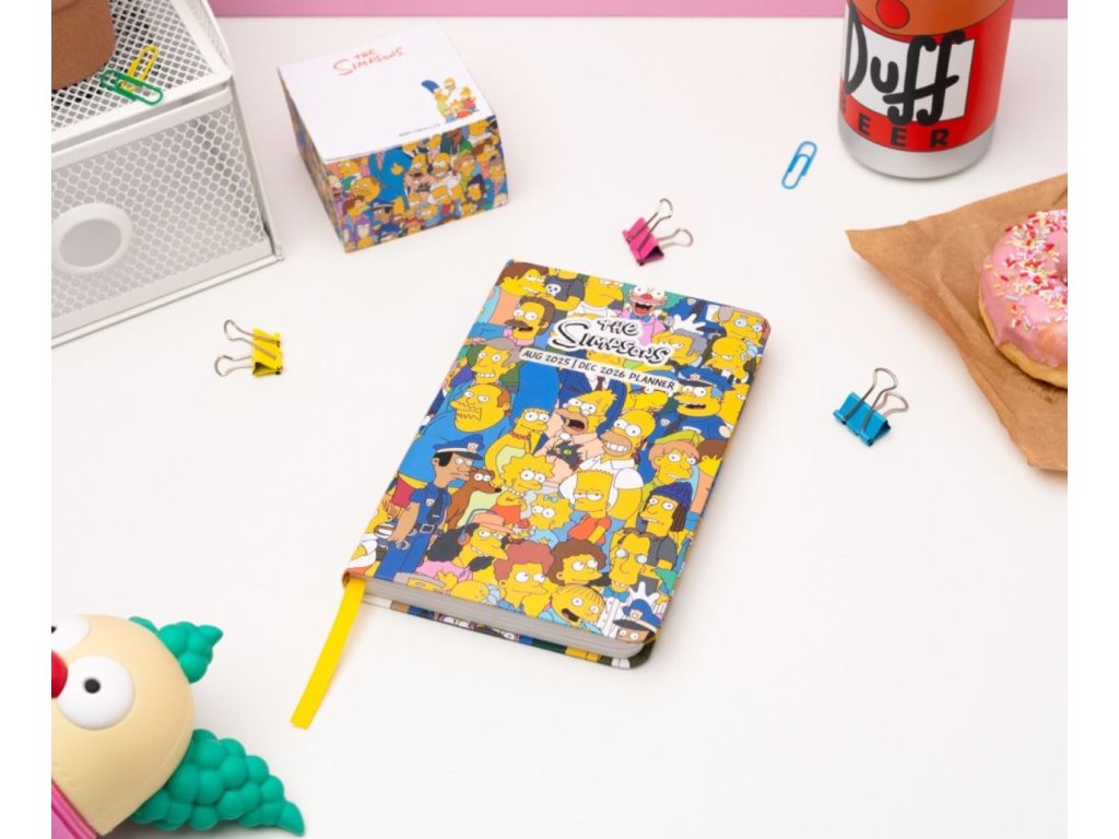 Oficiální produkt - 17 měsíční školní diář v tvrdé vazbě na rok 2025/2026 z katalogu kancelářských a dárkových výrobků s grafikou seriálu The Simpsons (Simpsonovi).