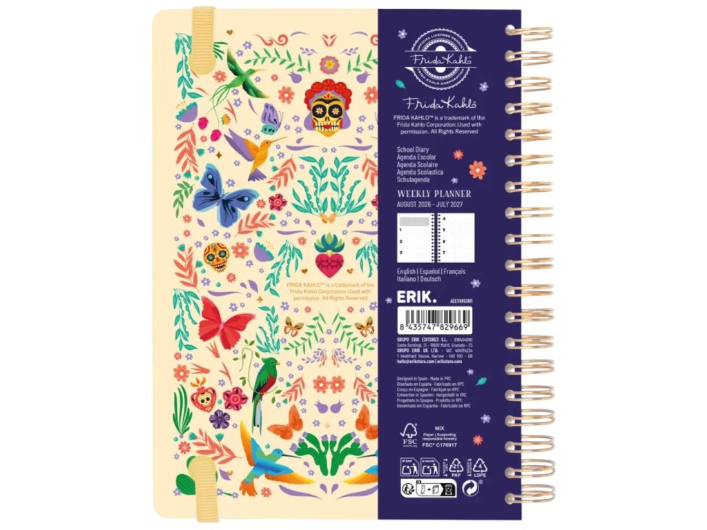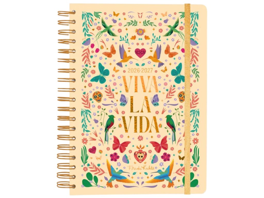 Oficiální produkt - školní 12 měsíční diář v kroužkové vazbě na rok 2026/2027 z katalogu kancelářských a dárkových produktů s licencí uměleckých děl Fridy Kahlo.
