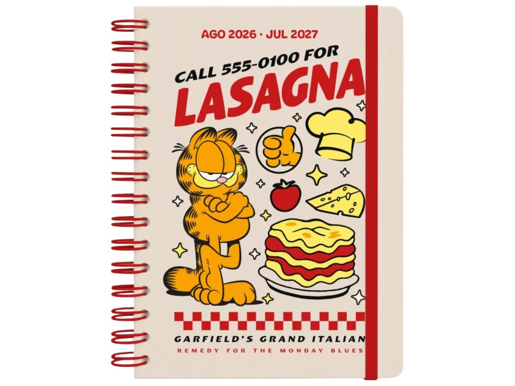 Oficiální produkt - školní 12 měsíční diář v kroužkové vazbě na rok 2026/2027 z katalogu kancelářských a dárkových produktů s licencí roztomilého kocoura Garfielda.