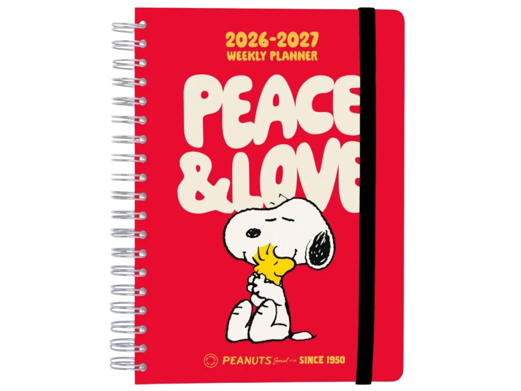 Oficiální produkt - školní 12 měsíční diář v kroužkové vazbě na rok 2026/2027 z katalogu kancelářských a dárkových produktů s licencí roztomilého psa Snoopy.