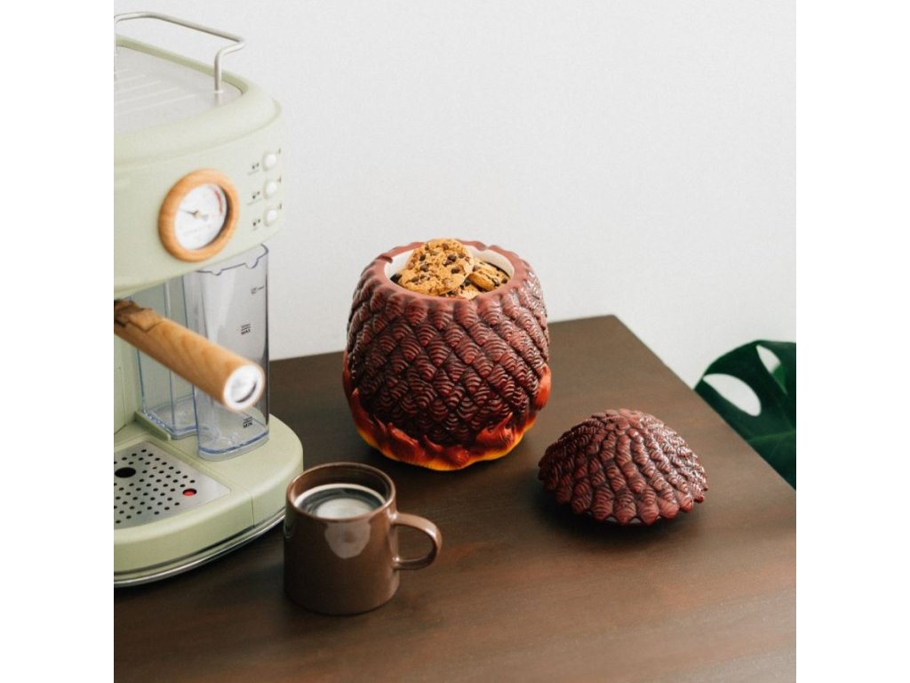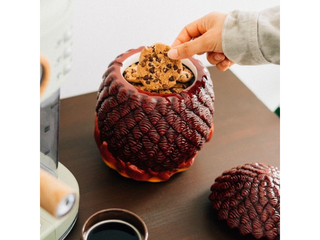Udržujte své sušenky, sladké pochoutky a další výrobky čerstvé s touto nádobou na sušenky. Tato dóza je vyhotovená do grafiky dračího vejce, díky čemuž ji okamžitě rozezná každý fanoušek fantasy seriálu Rod draka. Tuto praktickou skladovací nádobu můžete také použít k uložení jiných suchých ingrediencí.