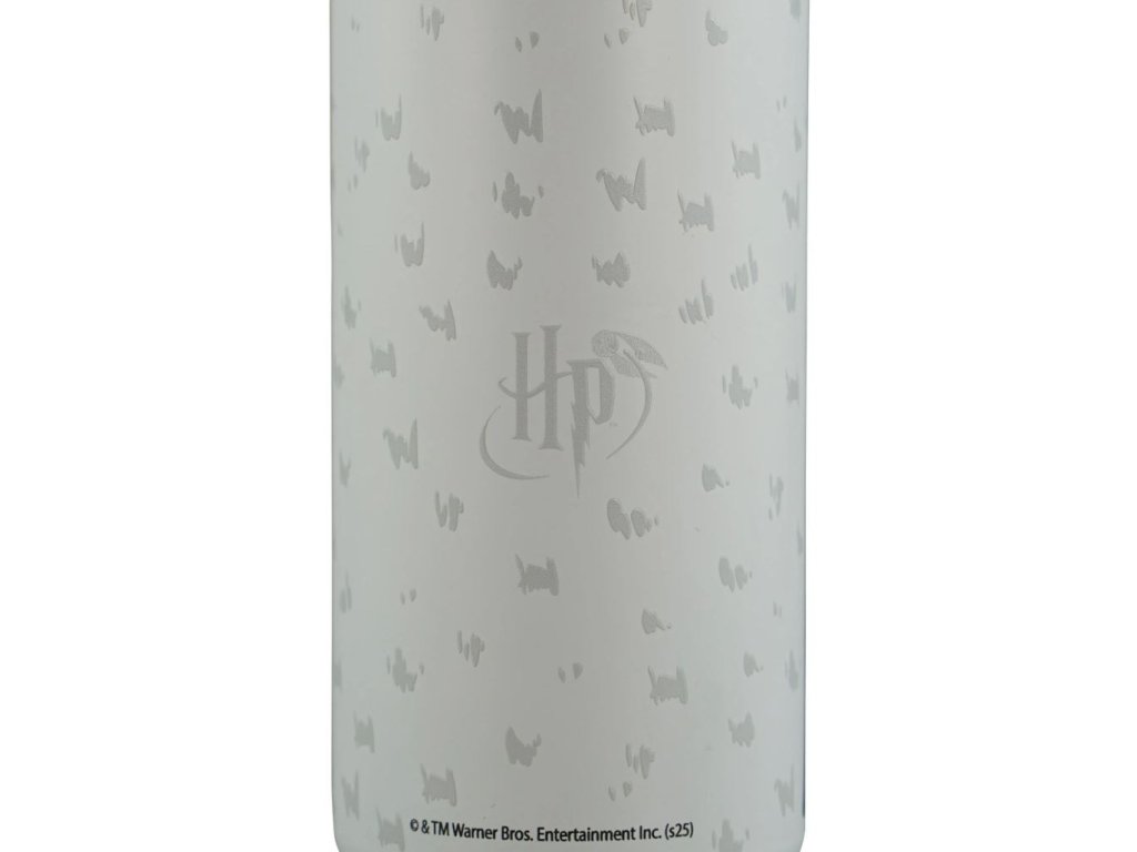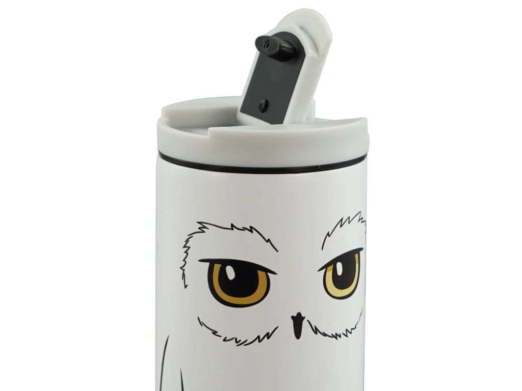 Bílý cestovní hrnek s grafikou sovy Hedviky a nápisem ,,HP" je ideální pro dlouhé dojíždění i krátké procházky do města. Hrnek je z nerezu s lehce otevíratelným odolným plastovým víčkem.