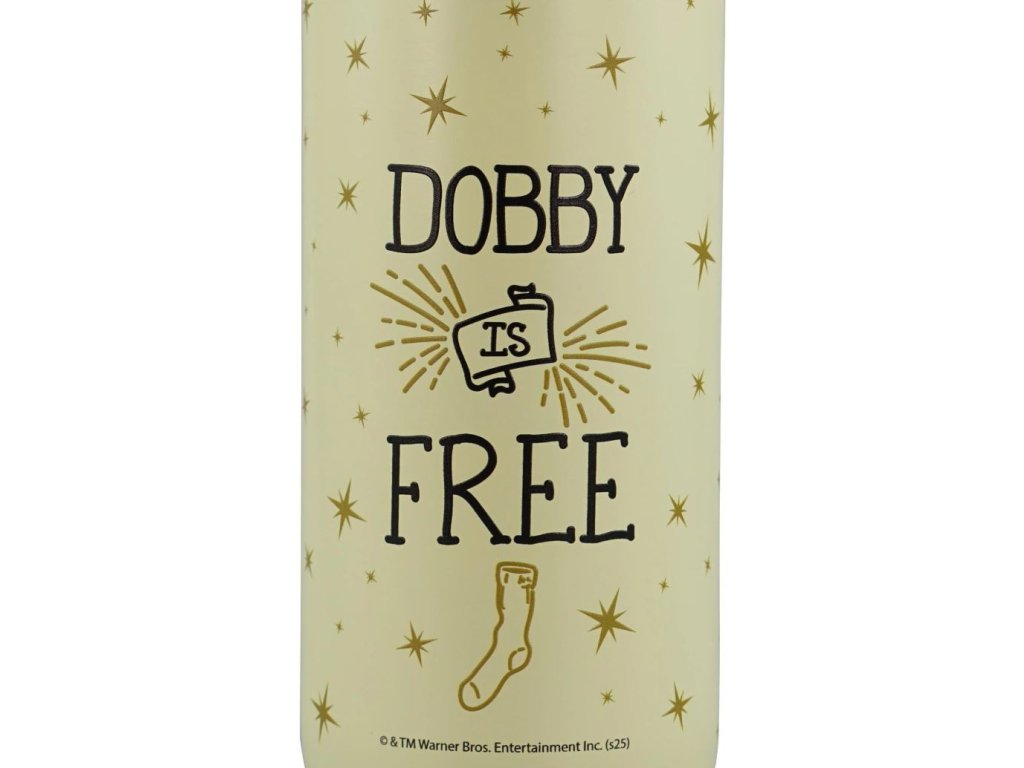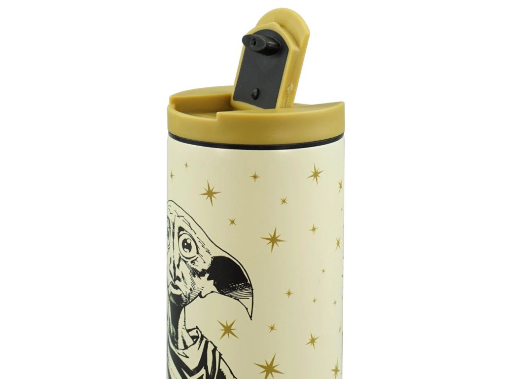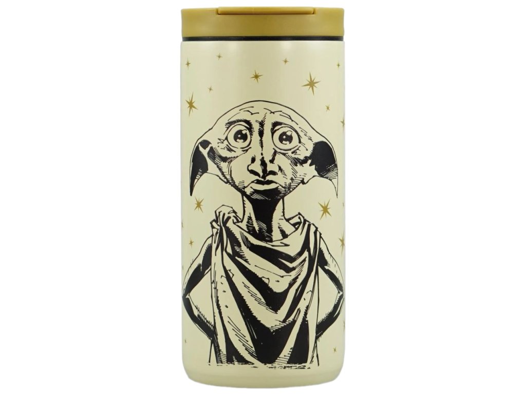 Béžový cestovní hrnek s grafikou domácího skřítka Dobbyho a nápisem ,,Dobby is free" je ideální pro dlouhé dojíždění i krátké procházky do města. Hrnek je z nerezu s lehce otevíratelným odolným plastovým víčkem.