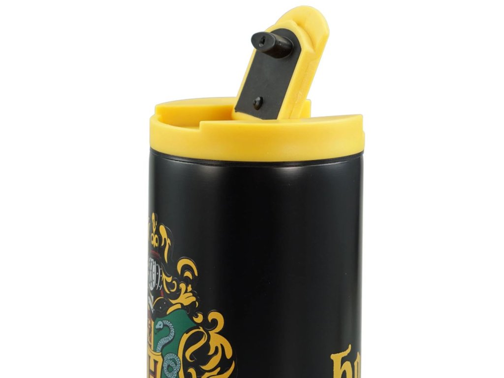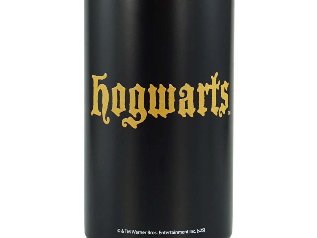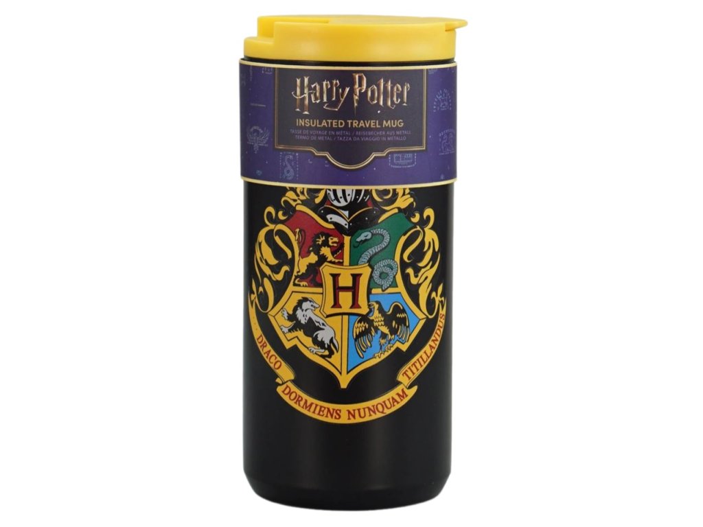 Černý cestovní hrnek s grafikou znaku kouzelnického hradu Bradavice a nápisem ,,Hogwarts" je ideální pro dlouhé dojíždění i krátké procházky do města. Hrnek je z nerezu s lehce otevíratelným odolným plastovým víčkem.