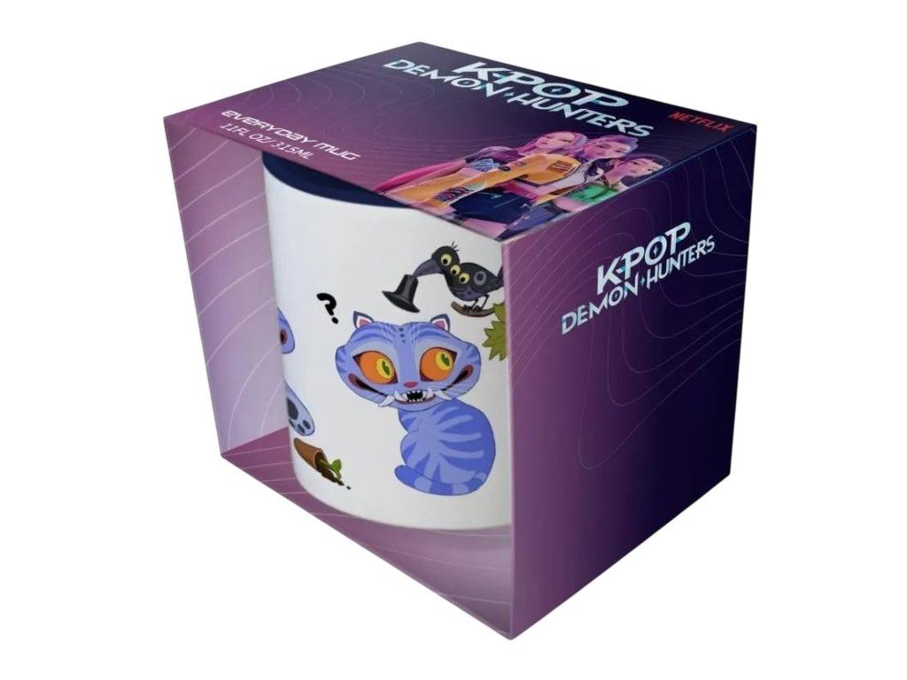 Oficiální produkt - hrnek a doplňkové zboží z katalogu výrobků s logem, fotografiemi, grafikou a licencí hudebního filmu K-POP Demon Hunters (Lovkyně démonů) od streamovací společnosti Netflix.