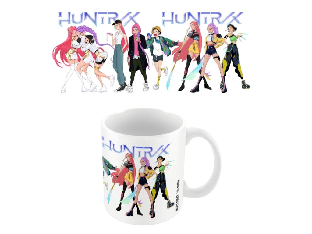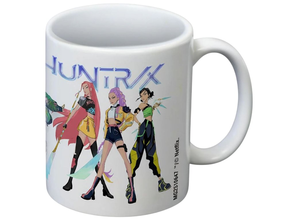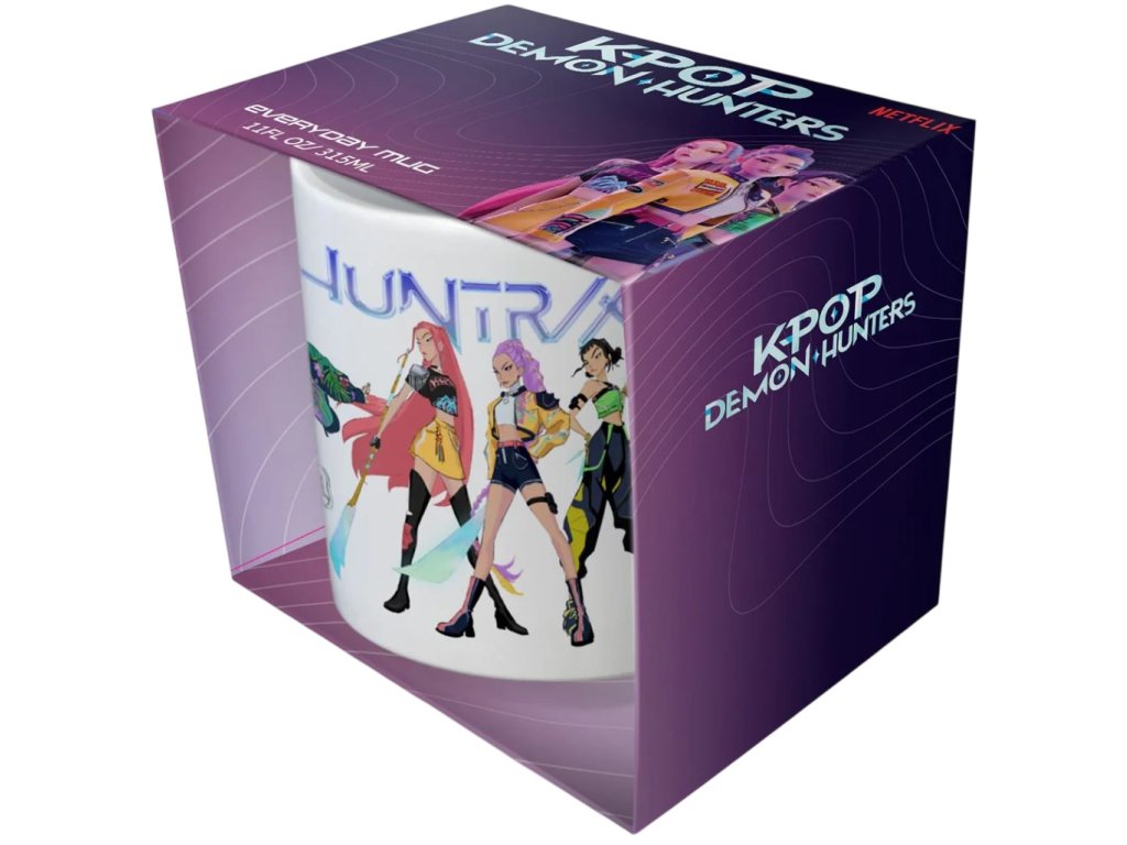 Oficiální produkt - hrnek a doplňkové zboží z katalogu výrobků s logem, fotografiemi, grafikou a licencí hudebního filmu K-POP Demon Hunters (Lovkyně démonů) od streamovací společnosti Netflix.