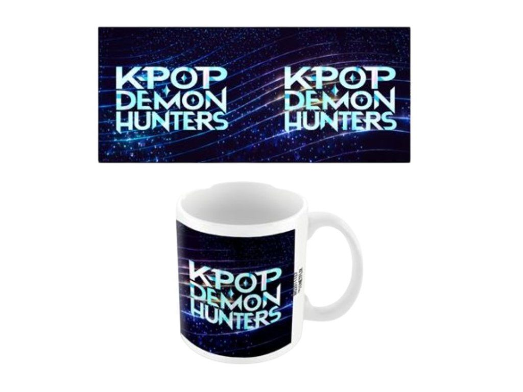 Oficiální produkt - hrnek a doplňkové zboží z katalogu výrobků s logem, fotografiemi, grafikou a licencí hudebního filmu K-POP Demon Hunters (Lovkyně démonů) od streamovací společnosti Netflix.