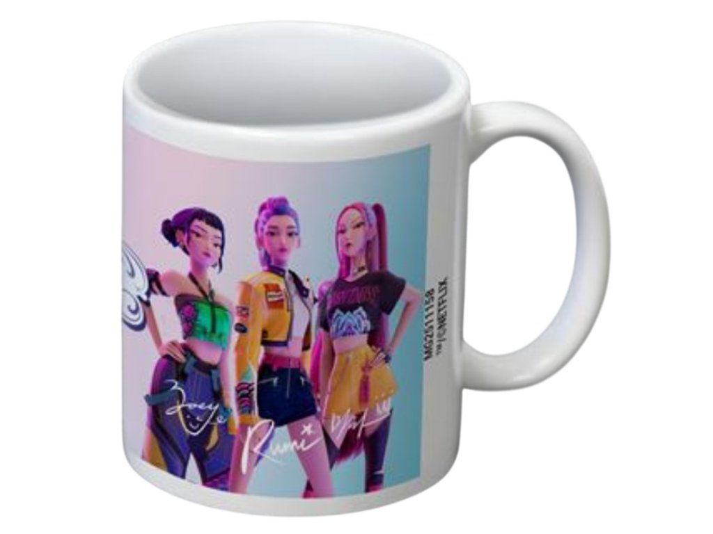 Oficiální produkt - hrnek a doplňkové zboží z katalogu výrobků s logem, fotografiemi, grafikou a licencí hudebního filmu K-POP Demon Hunters (Lovkyně démonů) od streamovací společnosti Netflix.