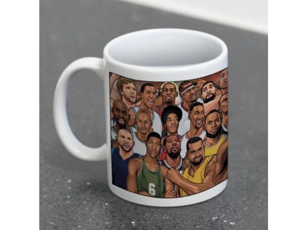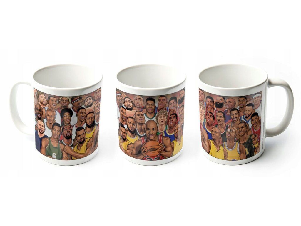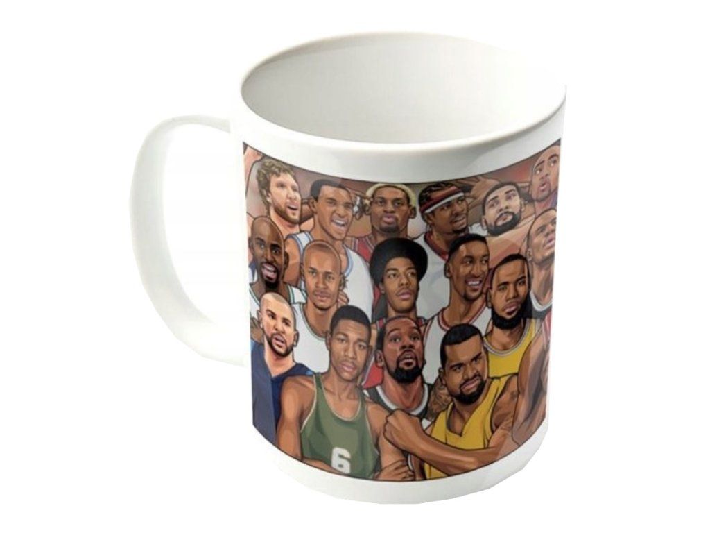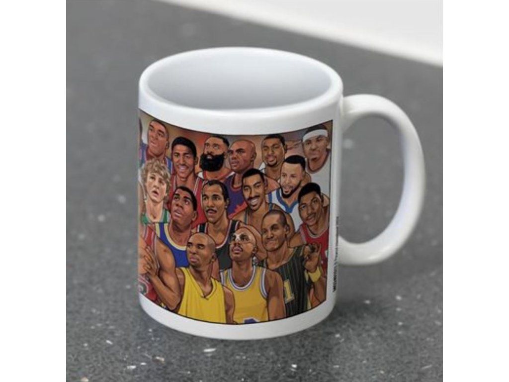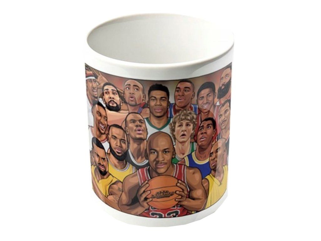 Bílý keramický hrnek s grafikou nejznámějších basketbalových hvězd. Hrníček je vhodným dárkem pro všechny menší i větší basketbalové fanoušky.