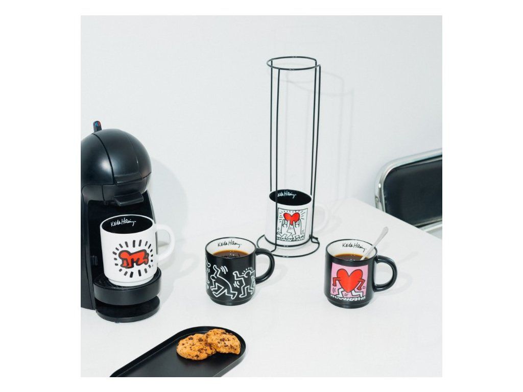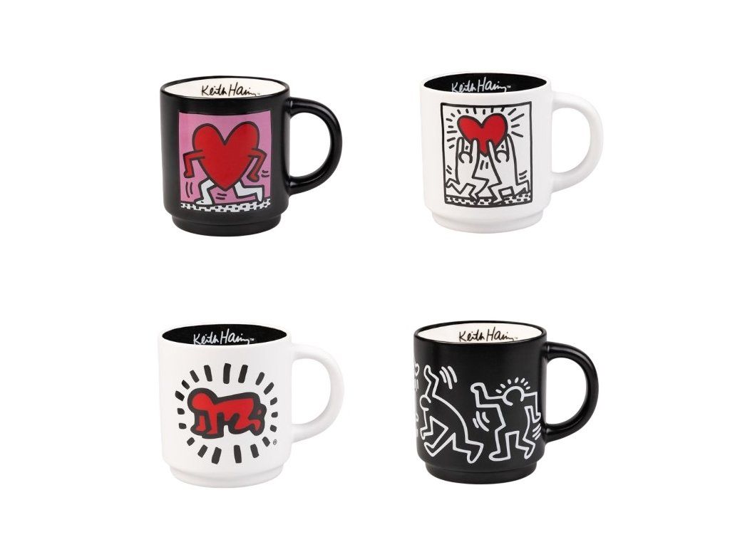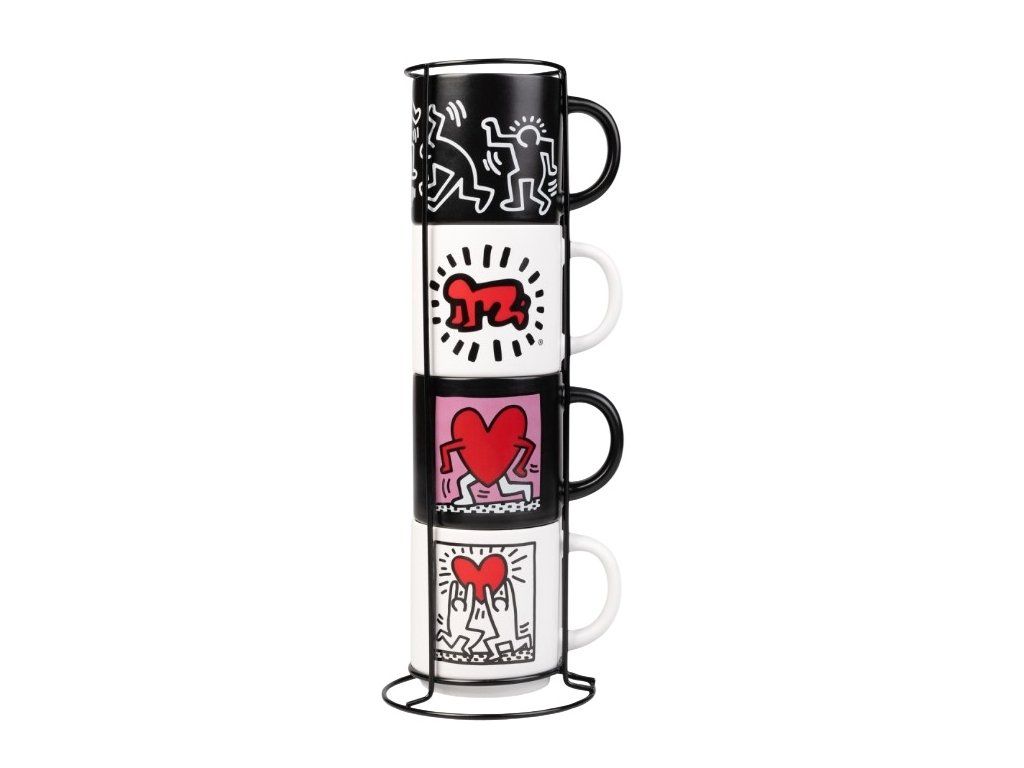 Set čtyř hrníčků s motivem Keitha Haringa. Keith Haring byl ikonický americký umělec, jehož dílo je známé výraznými liniemi a symboly, jako jsou tančící postavy nebo srdce. Šálky jsou umístěné na kovové podložce. Jsou vhodné do myčky a mikrovlnné trouby.