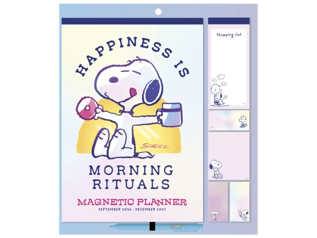 Oficiální produkt - šestnáctiměsíční plánovací kalendář a organizér na rok 2026/2027 z katalogu výrobků s licencí a grafikou z kresleného komiksu Snoopy.