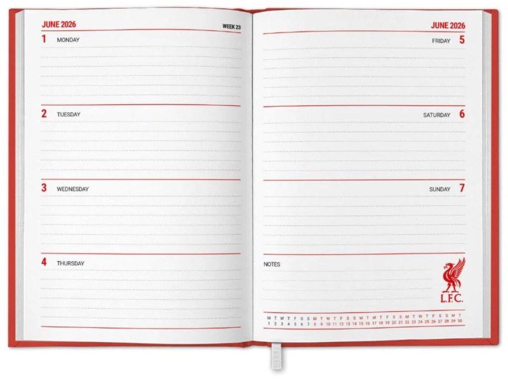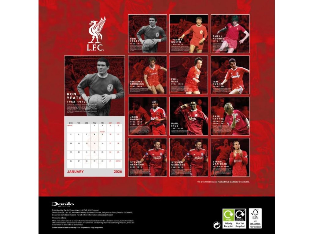 Tato krásná oficiální dárková sada obsahuje čtvercový kalendář 2026 s fotografiemi hráčských legend klubu FC Liverpoolu, diář A5 a pero, vše v úchvatné dárkové krabičce na památku.