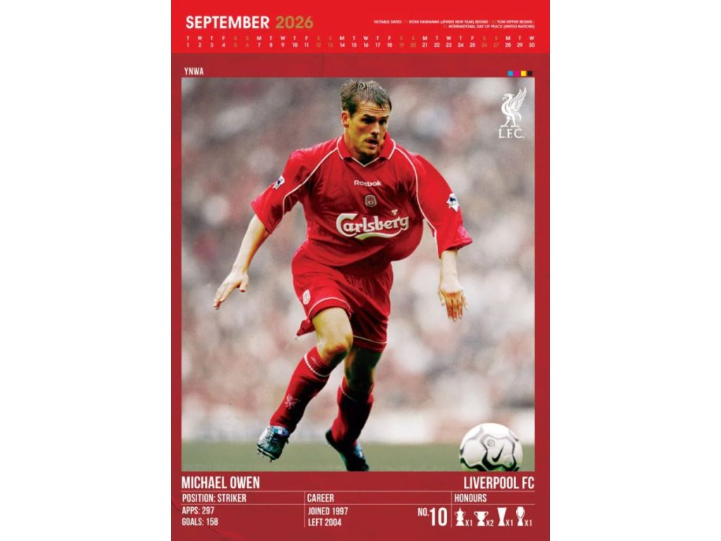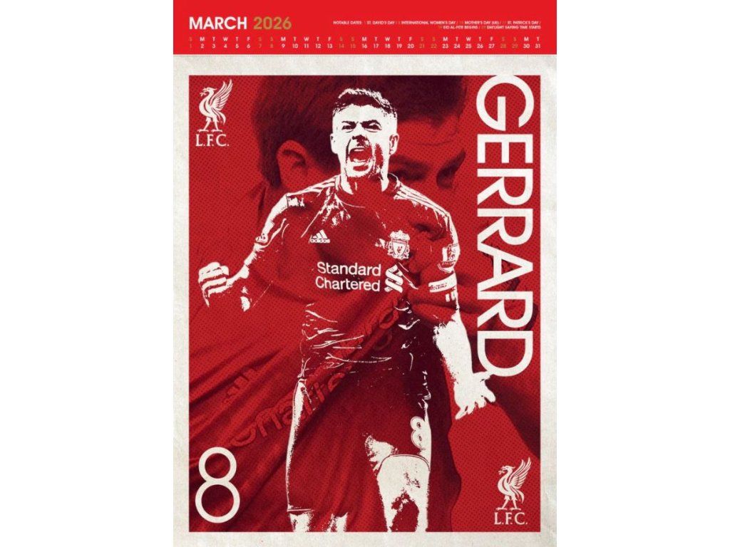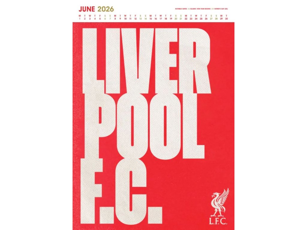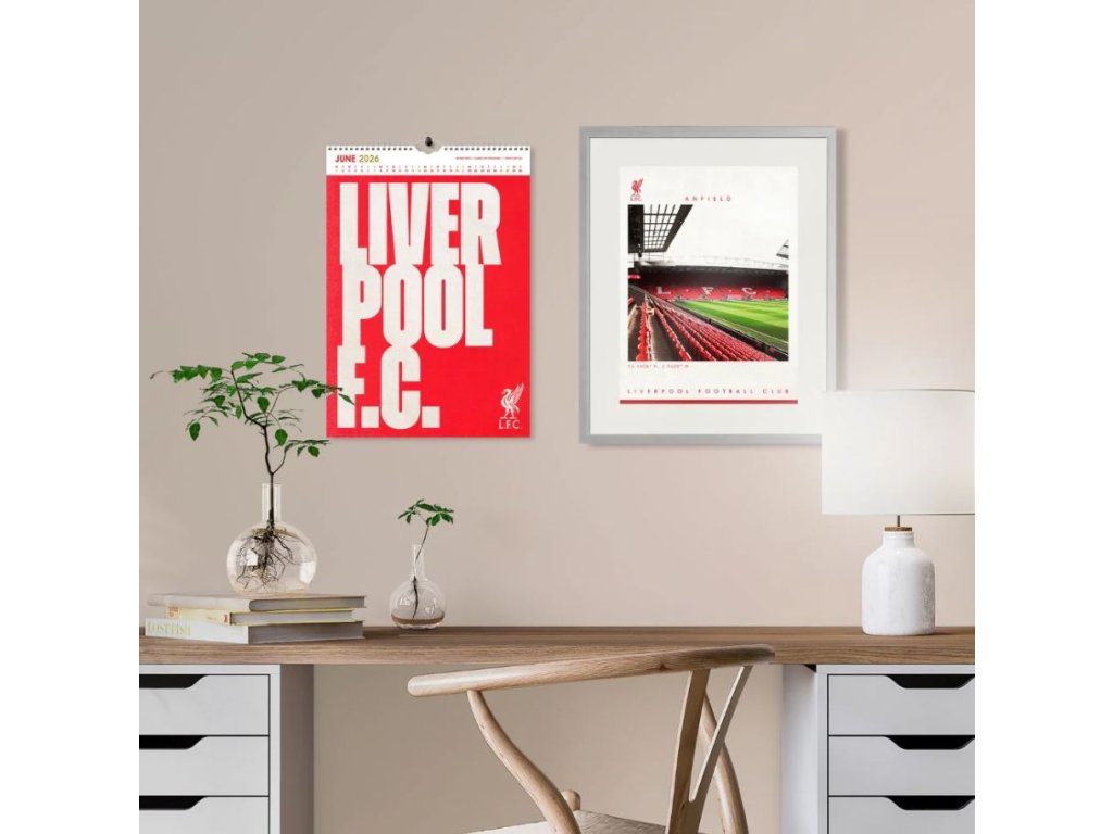Oficiální produkt - exklusivní dvanáctiměsíční nástěnný kalendář na rok 2026 s licencí britského fotbalového klubu FC Liverpool.