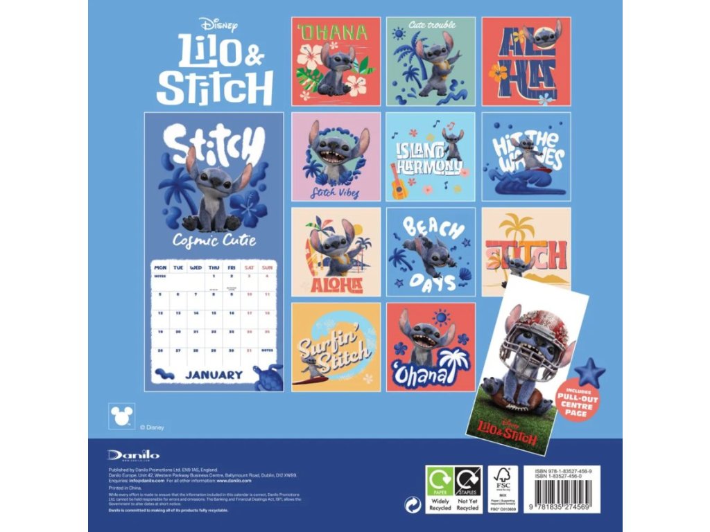 Oficiální produkt - nástěnný dvanáctiměsíční kalendář s licencí studia Disney k animovanému filmu Lilo and Stitch na rok 2026.