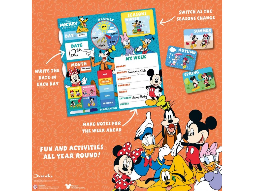 Nedatovaný dětský kalendář pro nejmenší ratolesti s obrázky postaviček animovaných pohádek Mickey Mouse.