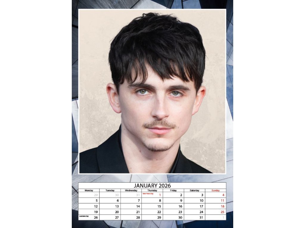 Oficiální produkt - exklusivní dvanáctiměsíční nástěnný kalendář na rok 2026 s fotografiemi populárního televizního herce Timothée Chalamet.