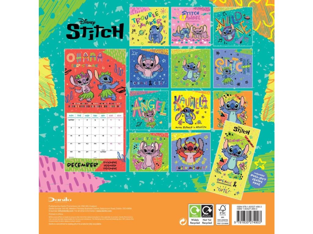 Dvanáctiměsíční nástěnný kalendář čtvercového square formátu (30,5 x 30,5 cm) s fotografiemi a grafikou postav z animoveného filmu Lilo & Stitch.