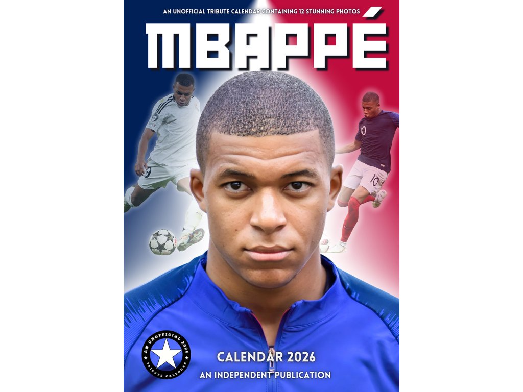 Exklusivní dvanáctiměsíční nástěnný kalendář A3 formátu (29,7 x 42 cm) s celkem 13 plakátovými obrázky a fotografiemi fotbalisty Kyliana Mbappého.