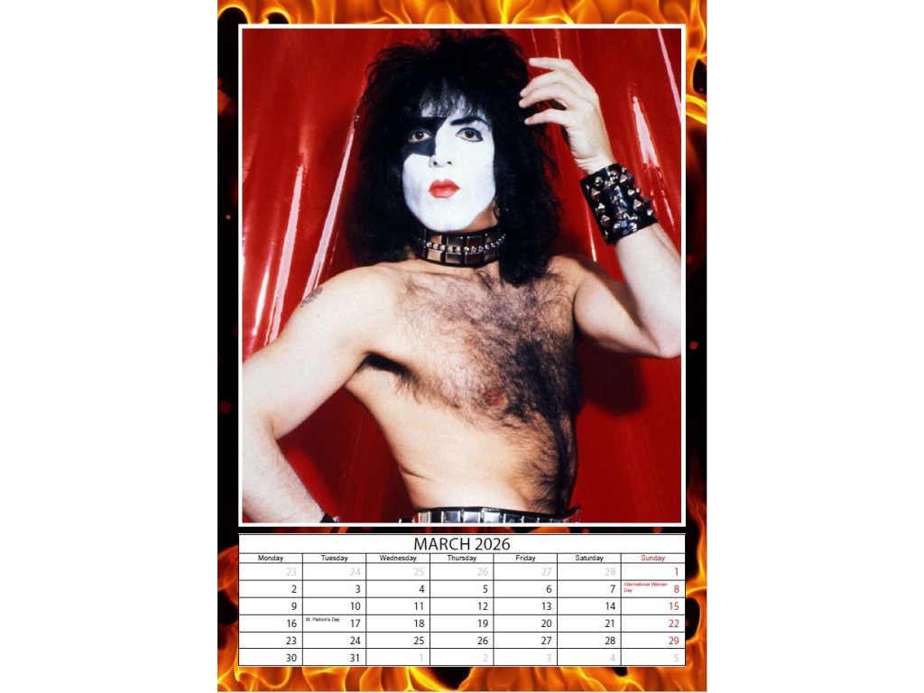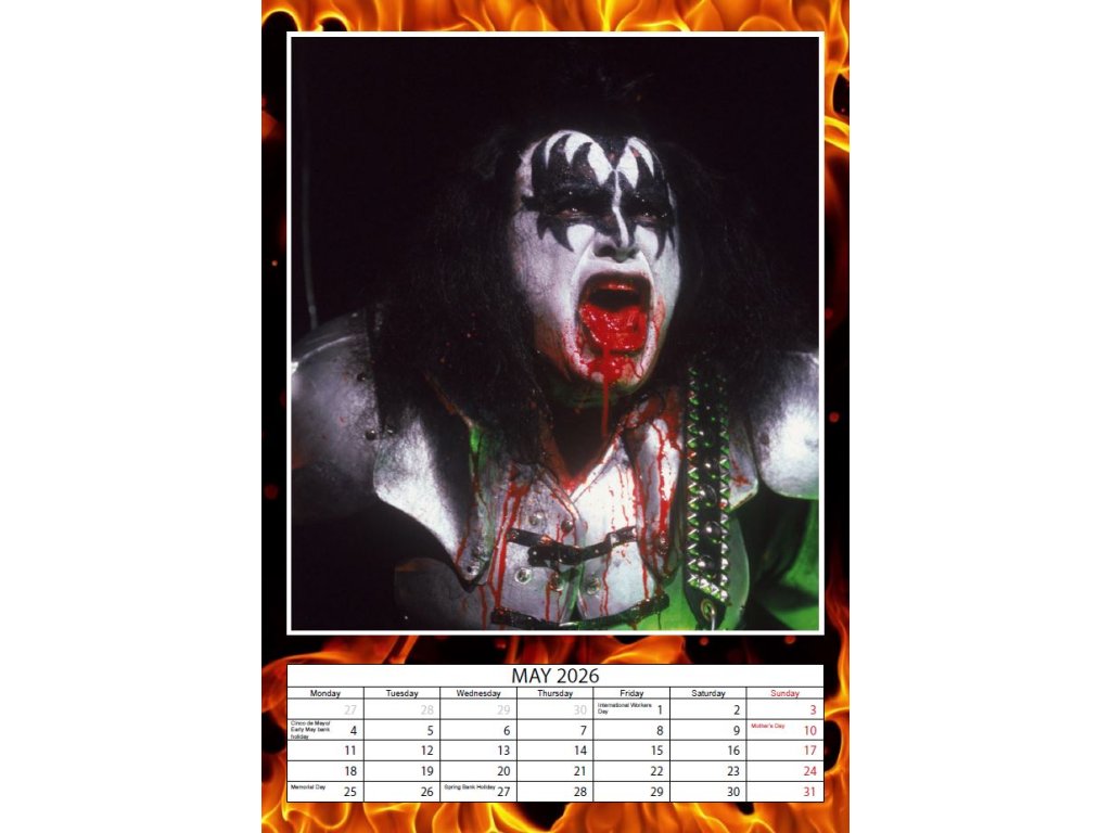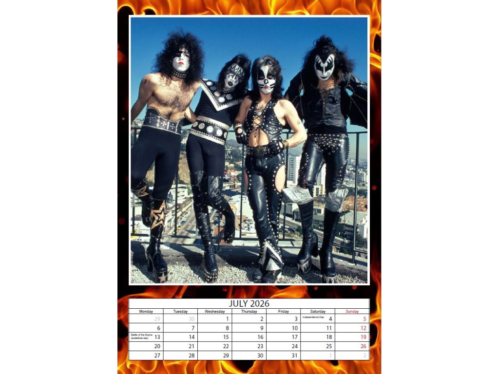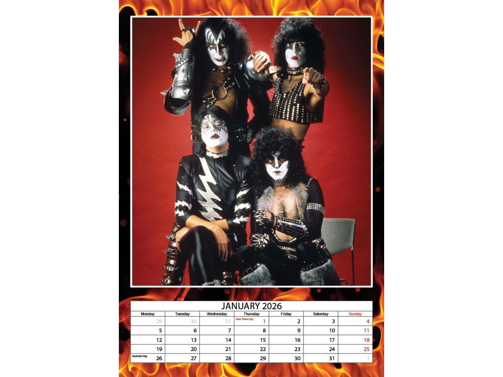 Exklusivní dvanáctiměsíční nástěnný kalendář A3 formátu (29,7 x 42 cm) s celkem 13 plakátovými obrázky a fotografiemi hudební skupiny Kiss.