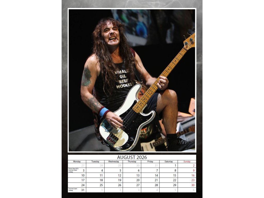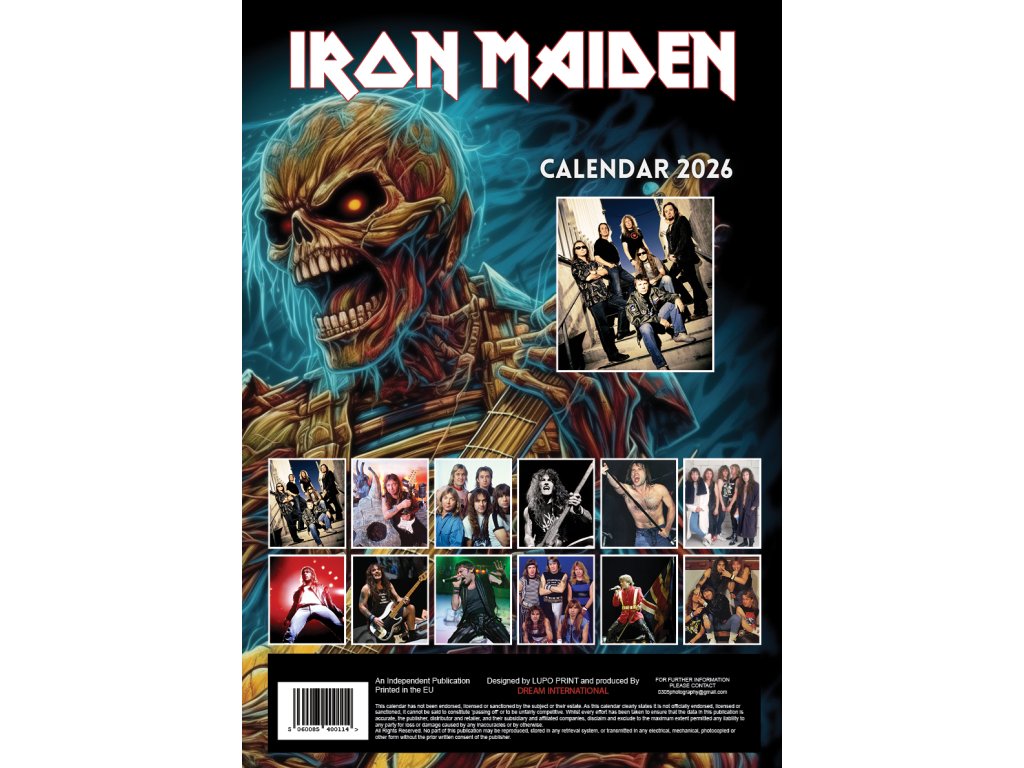Exklusivní dvanáctiměsíční nástěnný kalendář A3 formátu (29,7 x 42 cm) s celkem 13 plakátovými obrázky a fotografiemi hudební skupiny Iron Maiden.