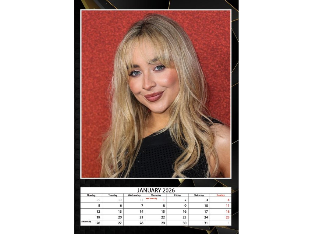 Oficiální produkt - exklusivní dvanáctiměsíční nástěnný kalendář na rok 2026 s fotografiemi populární americké herečky a zpěvačky Sabriny Carpenter.