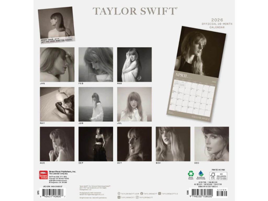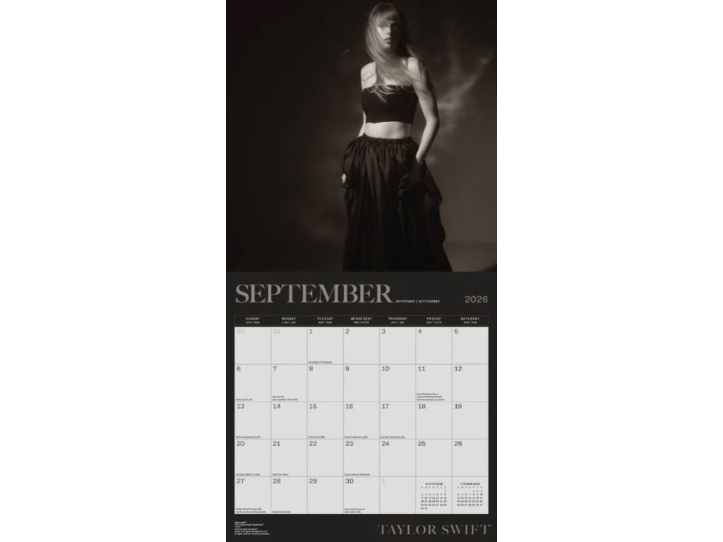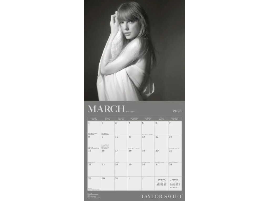 Oficiální produkt - nástěnný dvanáctiměsíční kalendář s licencí zpěvačky Taylor Swift na rok 2026.