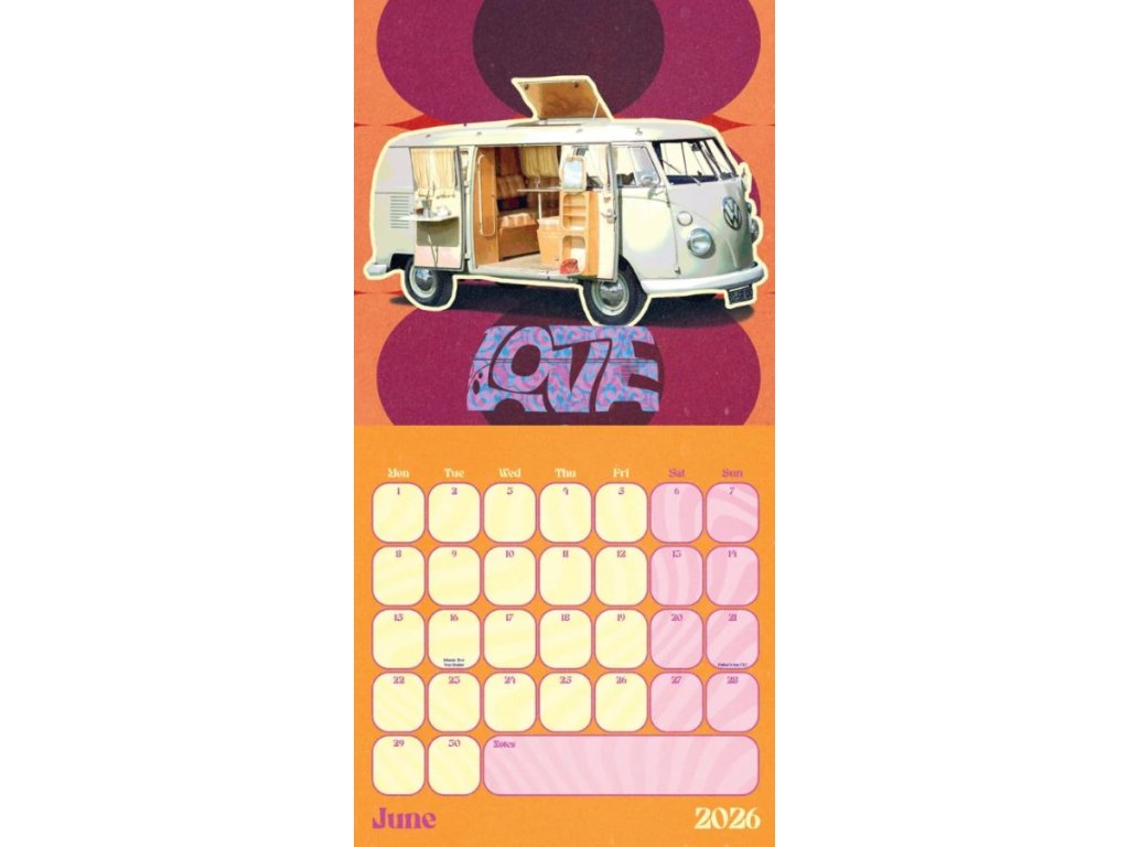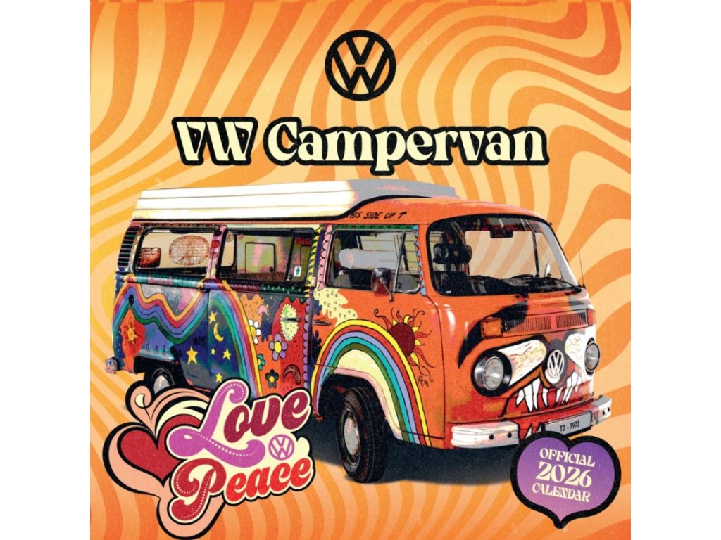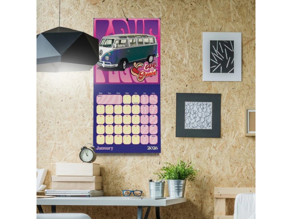 Oficiální produkt - nástěnný dvanáctiměsíční kalendář automobilky Volkswagen na rok 2026 s licencí kultovní verze automobilu Transportér.