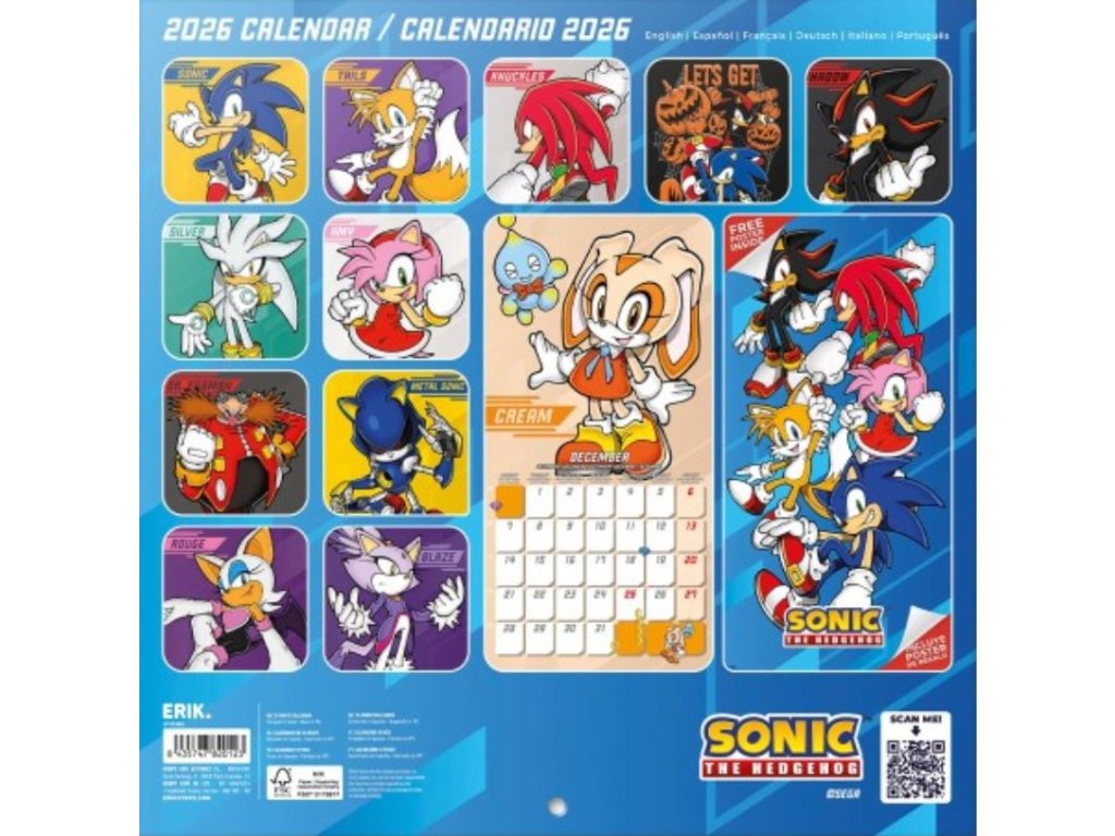 Oficiální nástěnný kalendář na rok 2026 z katalogu produktů s licencí sérií videoher SEGA - Sonic.