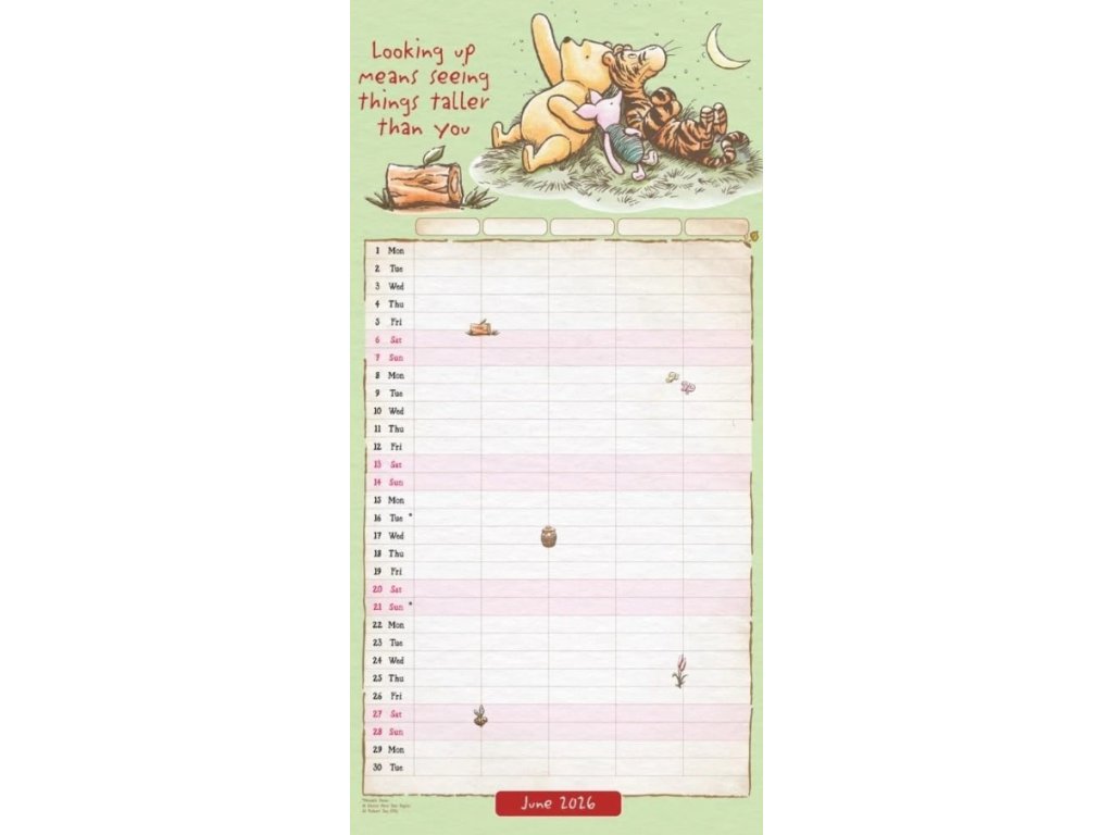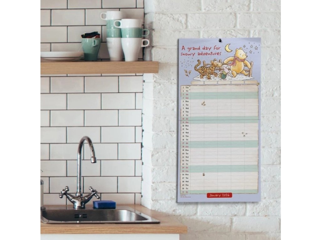 Oficiální produkt - dvanáctiměsíční nástěnný plánovací kalendář a organizér studia Disney na rok 2026 s licencí a grafikou animovaných pohádek Medvídek Pú.
