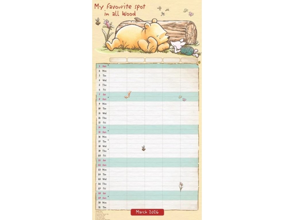 Dvanáctiměsíční nástěnný plánovací kalendář čtvercového square formátu (30,5 x 30,5 cm) s celkem 12 měsíčními listy, vyvedenými s grafikou a kreslenými postavičkami z filmů Medvídek Pú.