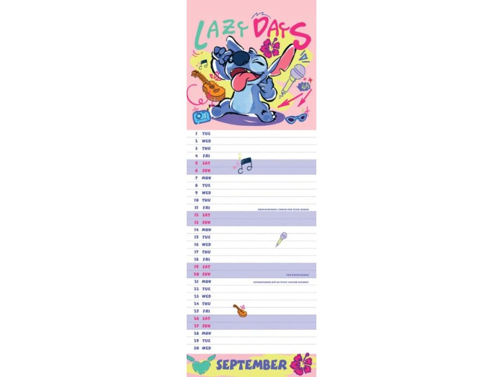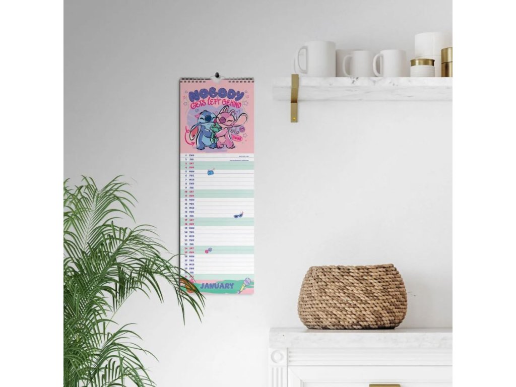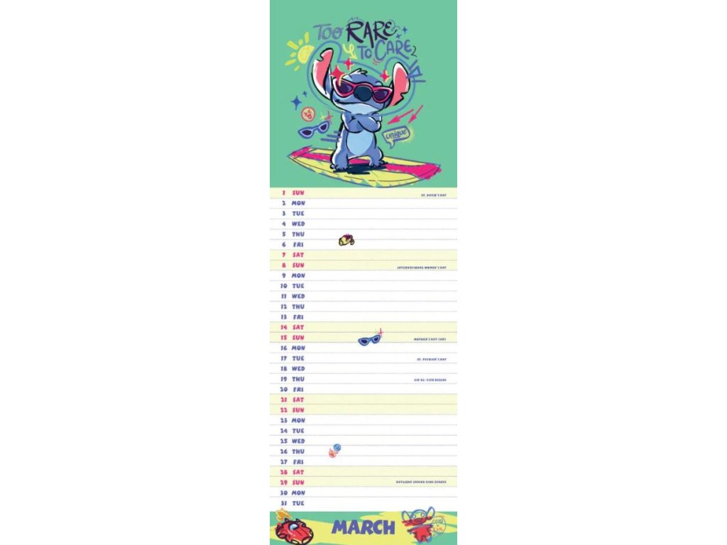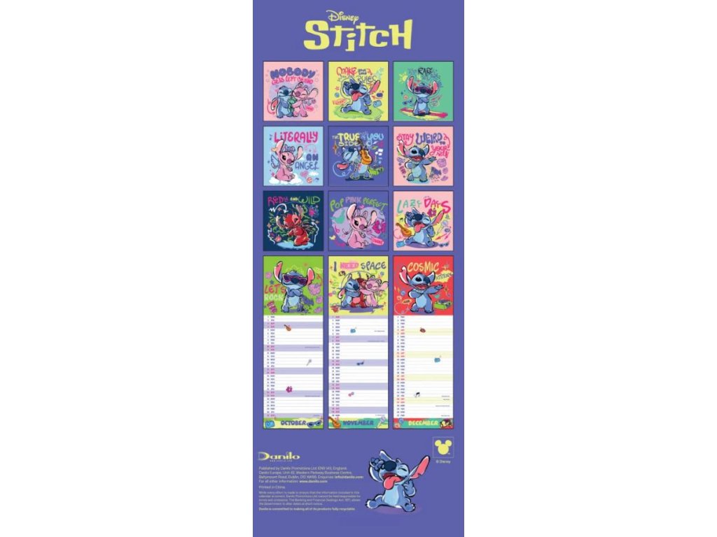 Dvanáctiměsíční nástěnný kalendář slim - polovičního A3 formátu (14,4 x 42 cm) s celkem 13 kreslenými obrázky postav z filmů Lilo & Stitch od filmového studia Disney.